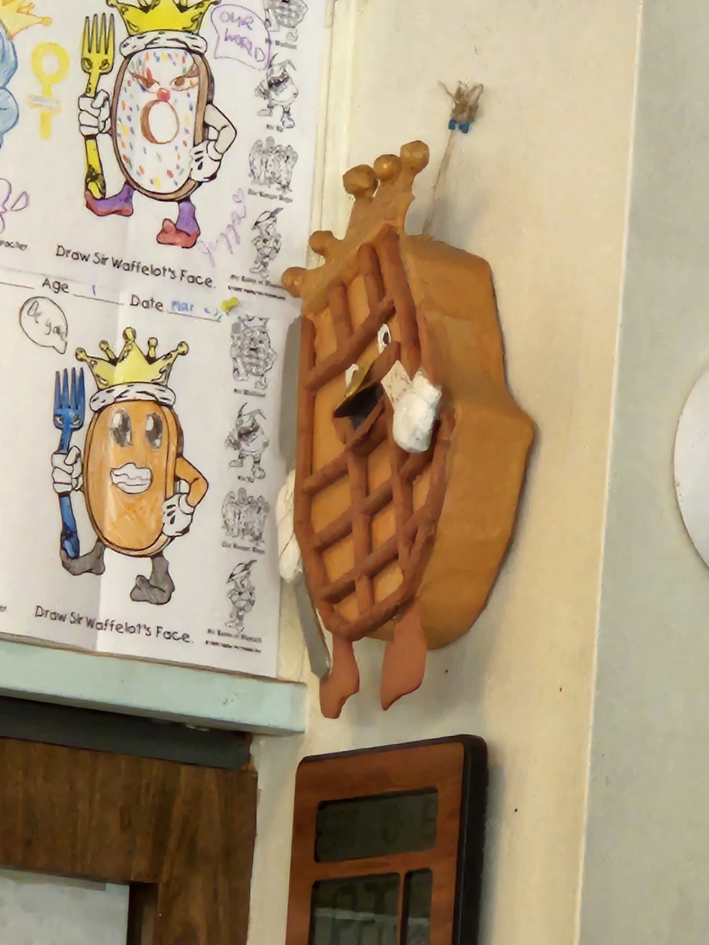 The atmosphere is so nostalgiac. Reminding us of old ihop mixed with Solvang (if you've been there you'll know what I mean) vibes. The decor was old school diner where the booths side by side felt as if you were eating with another family. Cozy yet fun! The colorful drawings on the wall of kids and old kids interpretations of the waffle king were humorous and a treat to scan over.