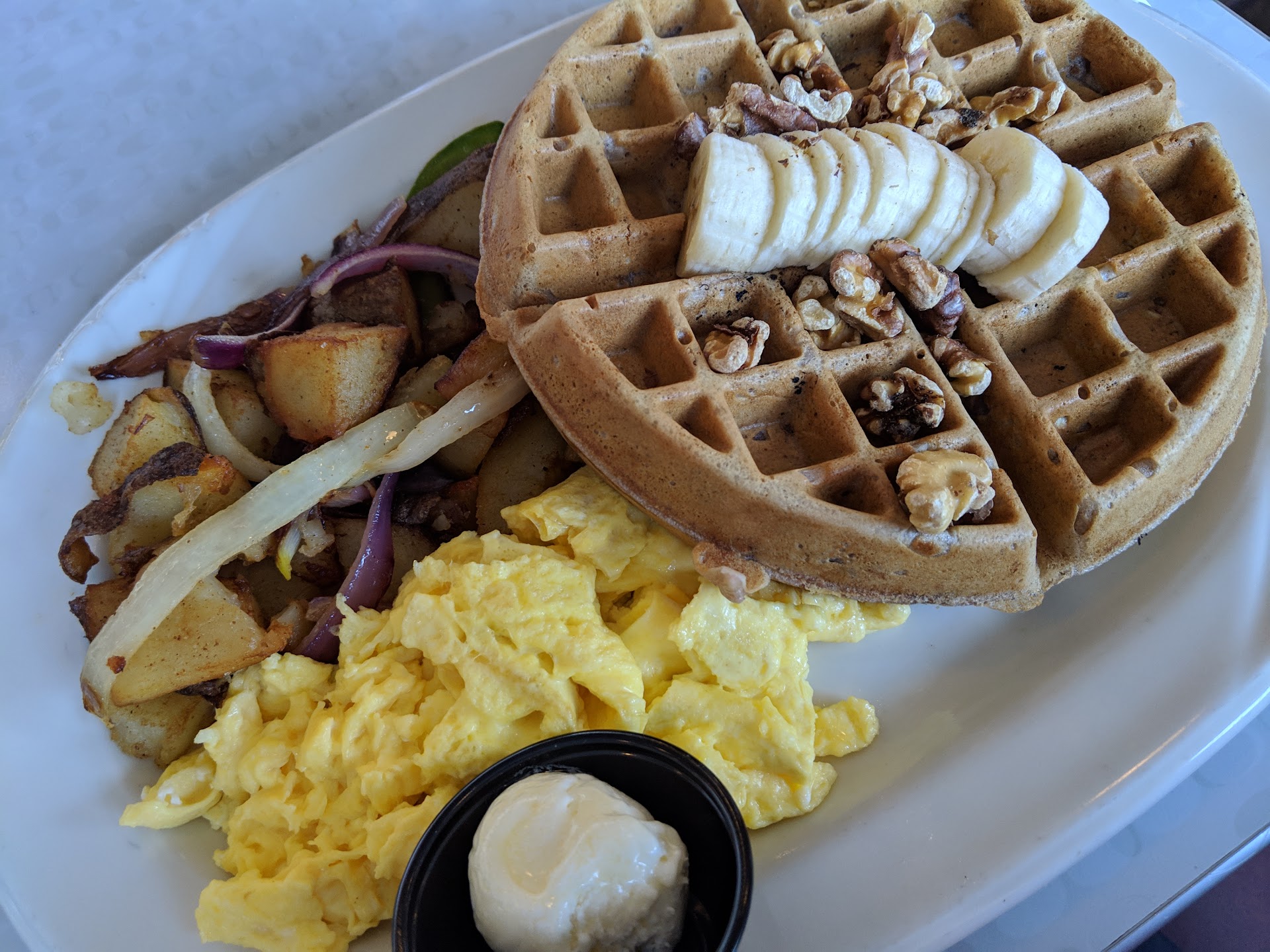 The other person ordered a vegi casserole which was ok. To be fair we are at the waffle spot, so obviously the specialty is waffles. I would definitely order something with waffles here each time! We had 3 plates between 4 of us and we left pretty darn full.