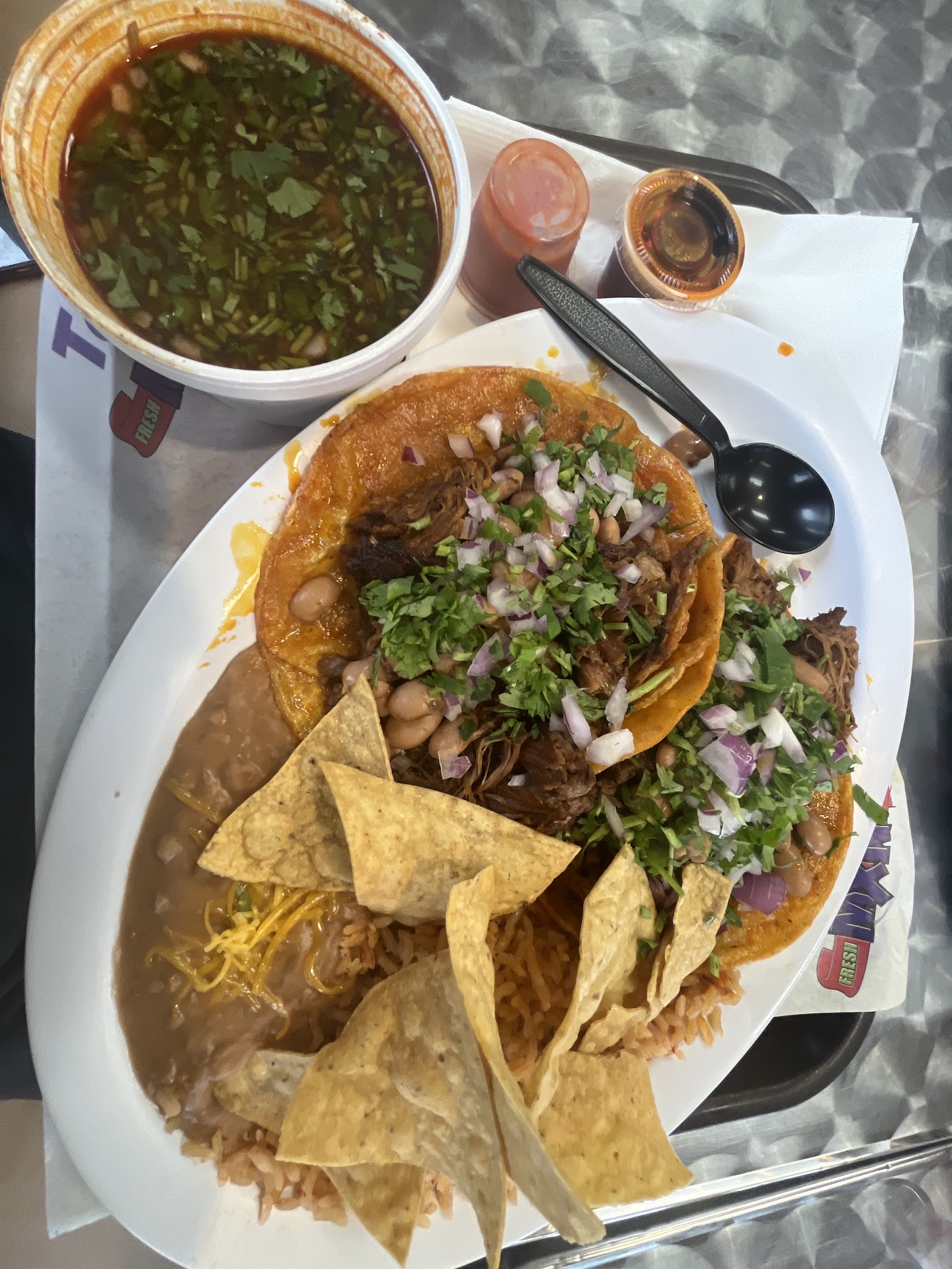 Decided to give this place a try while in the area & wasn't disappointed. The full order of Carne Asada fries was tbh, hefty & good temp, look. I actually made it into 2 meals, vs the typical ones from some other shops that end up being 1. Had plenty of toppings, meat & for a similar price point if not cheaper than some other's, worth it! The place was blasting music when I went to pick up my order. Had a dive bar vibe on that front, but it was 8:30-9pm about & they sell beer. The lady at the counter was quiet but nice, didn't get a bad feeling from her. The red & green sauces I must admit were pretty lackluster & the salsa bar wasn't open, but not a deal breaker. What was really odd, was the bigger Styrofoam packaging for the "full" order. They used the trisected ones you get with a combo plate with rice/beans/entree. Stabbing at the mass of food to hit a ridge, at first had me thinking something harder than the ordered food had fallen into the meal lol, perhaps they ran out of the normal flat bottom ones? Unlike quite a few places that charge a non-cash service fee I've encountered, they charge a 3+% fee based on total amount, versus a flat fee. That can be off-putting to some, especially if they make a large,...