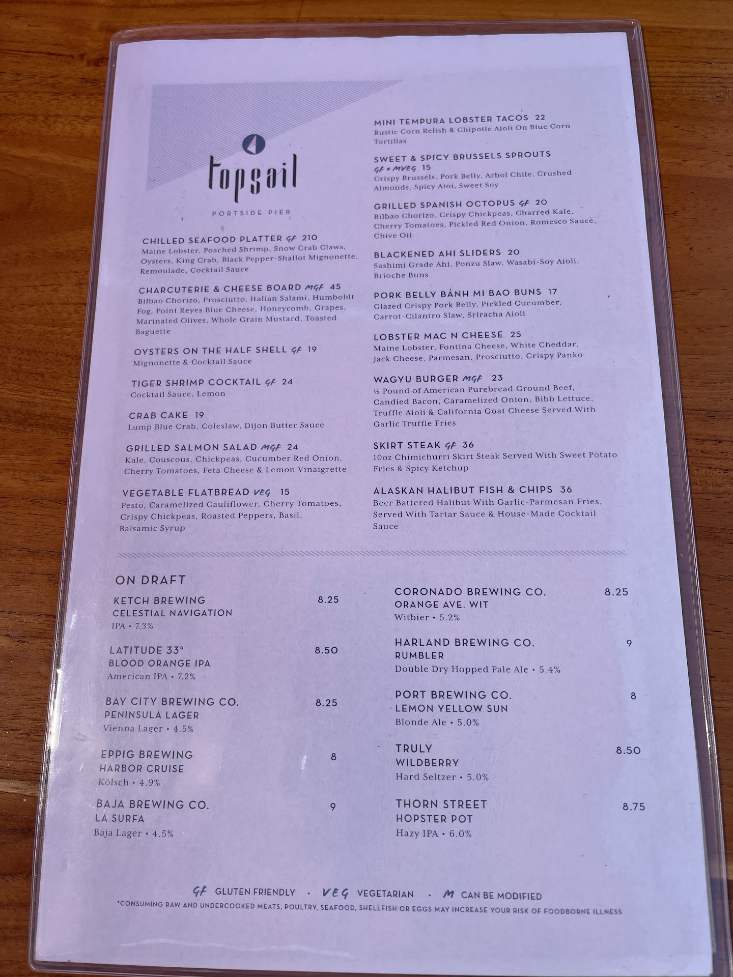 Topsail is one of the newer additions to San Diego's waterfront eatery & bar scene. Nestled on top of the Brigantine restaurant with the same shared entrance, Topsail starts off with a spiral staircase up, encased in a glass dome. The host stand is right at the top of the stairs; hostesses have always been very welcoming and friendly.
