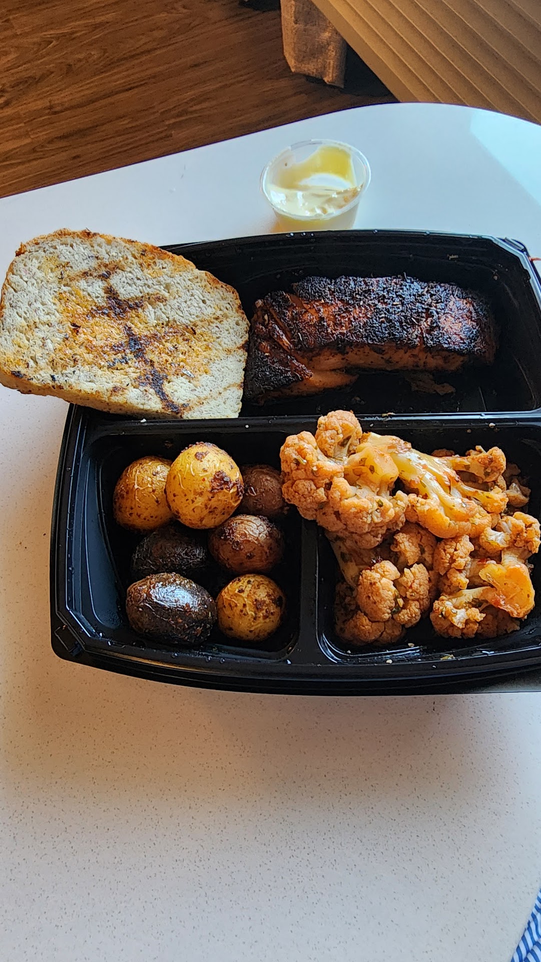 Yesterday I ordered the blackened salmon with hollandaise. It came with 2 sides and I got the chipotle & herb marble potatoes & harissa lime cauliflower and a slice of gluten free bread for $22.14 (with tax.) I made sure to ask for a glove change because I'm celiac and need gluten-free.