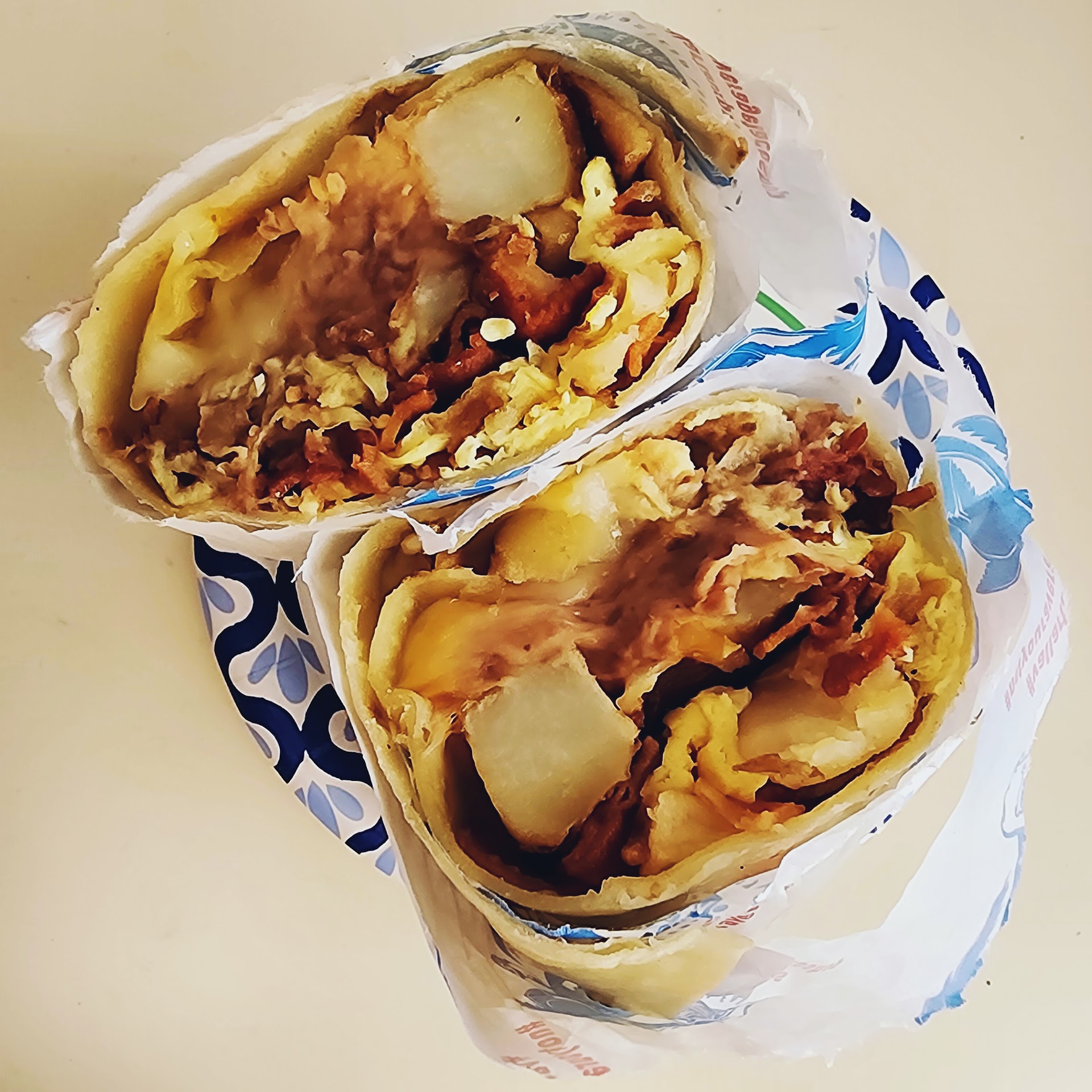 breakfast burrito: 7.5/10 - it's just 'breakfast burrito all day' on the menu, no description. you choose between bacon or ham or sausage when you order. it's got eggs, potatoes, cheese, and refried beans. the cross section had an even mix of fillings when i cut it in half, so far so good. i was a little concerned toward the end of the first half because it became all unseasoned potatoes and tortilla. i wondered if they only load everything in the middle of the burrito due to people taking cross section pictures for their lame reviews. luckily the second half had the same generous distribution of eggs, bacon, and beans all throughout.