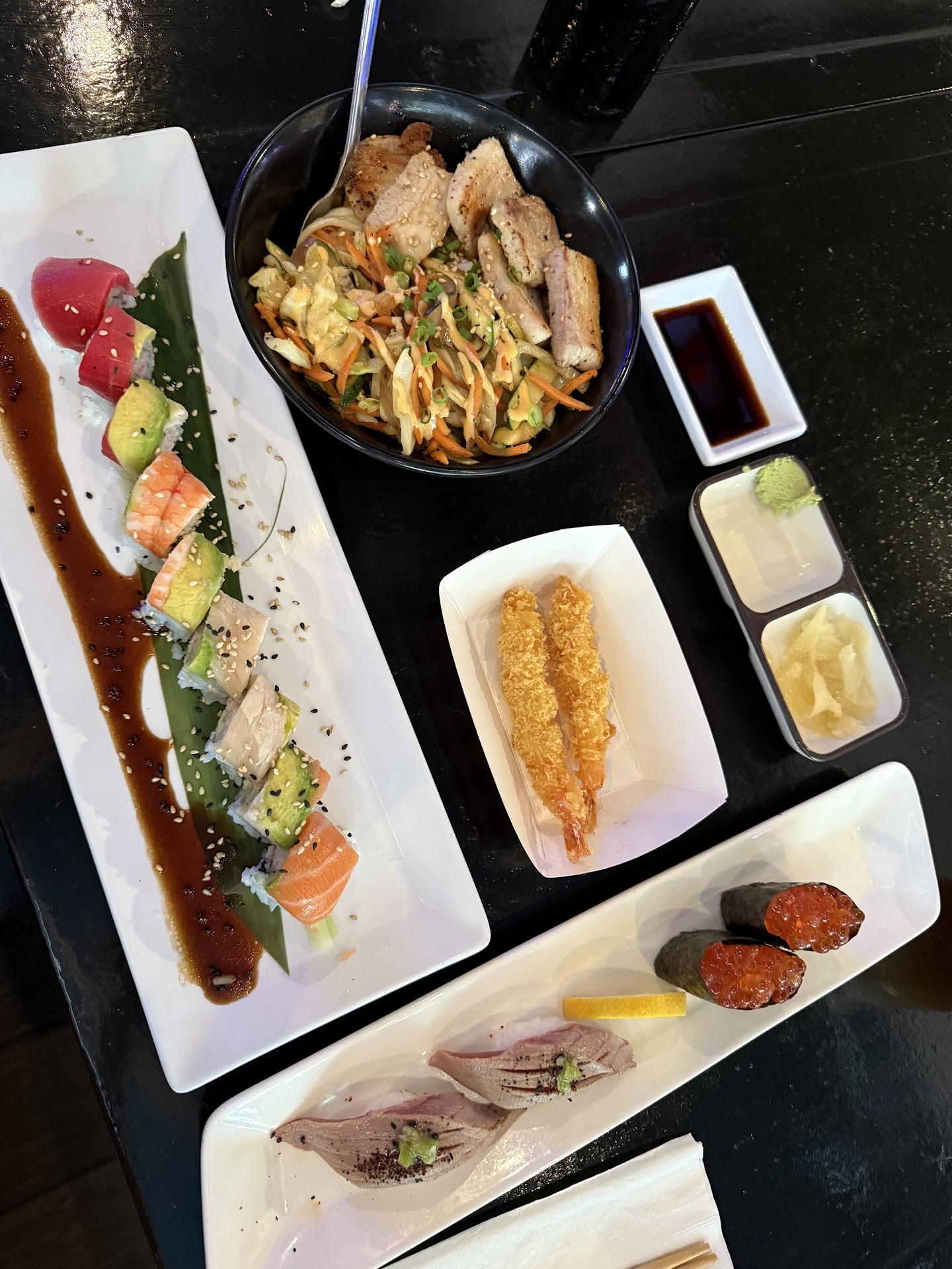 Read moreCame for lunch and got the $20 lunch combo with pork belly and a rainbow roll. I assumed the pork belly was on its own because the menu didn’t say it comes with anything under the lunch combo but it actually comes with a big bowl of rice and veggies! It was tasty! Also added 2 shrimp tempura for only $4 which is a great price but the quality of the tempura was just ok, not great. Also ordered the 2pc Ikura (salmon roe) and that was very tasty, the 2pc seared tuna nigiri was good but could have had a nicer sear on it and better quality tuna, lastly the 2pc scallops (not pictured) were just ok, nothing to rave about. My favorites were the salmon roe, seared tuna, and pork belly.