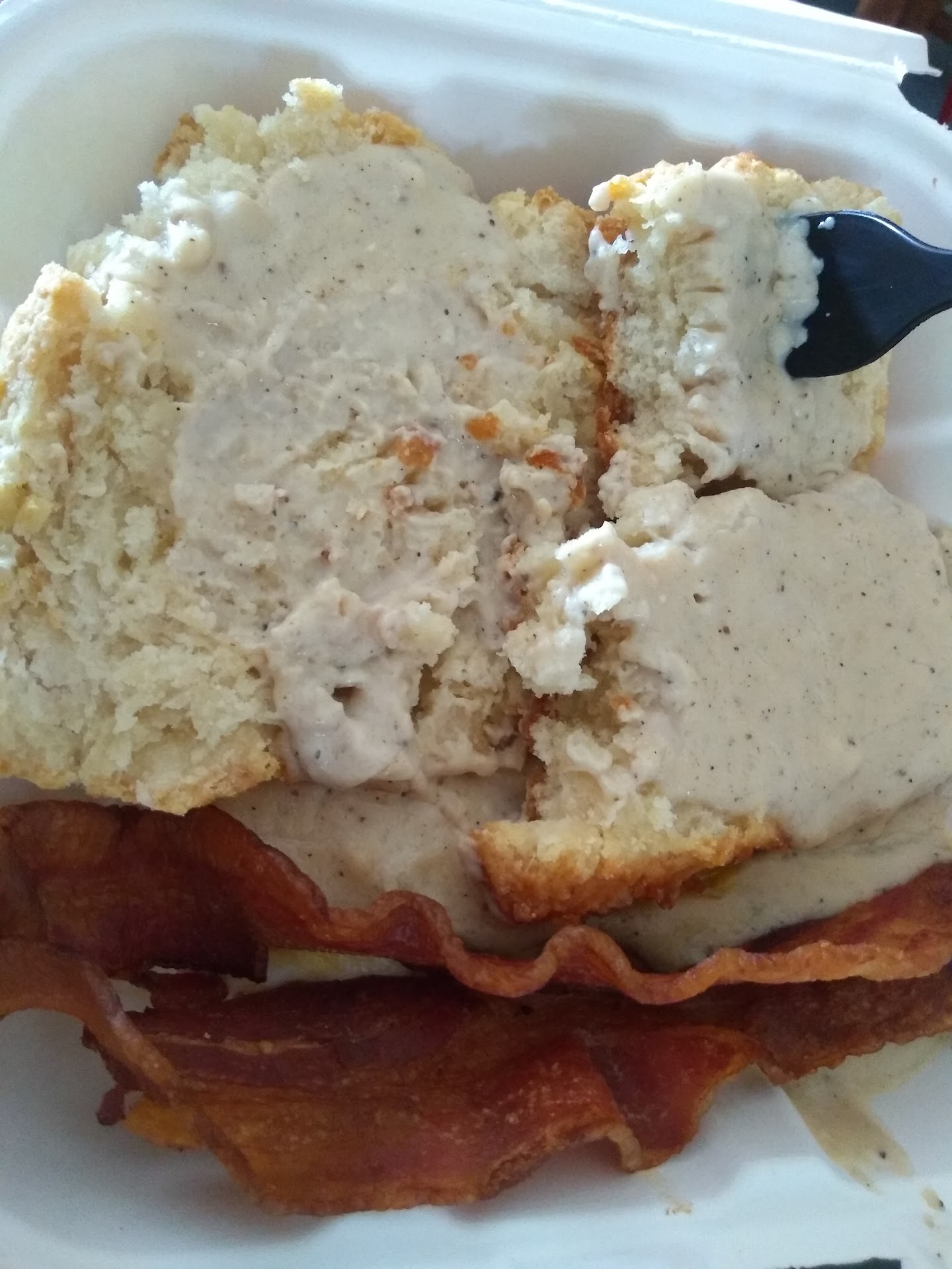 Read moreLocation is nice, very clean, staff are helpful and get orders together quickly. Bacon is great, eggs are fine. Biscuits are awful. Biscuits are not supposed to be crunchy, these biscuits are more like scones than biscuits, on the heavy side, not light at all. And the gravy, fairly certain this is from a mix. Which is a bummer overall as I had figured a bakery might have outstanding biscuits, other baked items are very good. (Imagine they overwork the dough, and use the same flour for everything (need self rising, I know might have some objections to it entering the kitchen, though similarly if you want great oranges - you must fertilize the tree with steer manure, sometimes great things require things that ain't so great), taste okay, but with the gravy, super icky, which is odd because this is supposed to be a popular item. Mind you, from So. Cal, so not the expert on biscuits and gravy (southern dish, a staple breakfast item, made with easily obtained ingredients), but I have had amazing biscuits and gravy and these are icky. (Did I mention crunchy? Bleh) May return for other items in future, french toast is great and breakfast sandwich is really good (great job on those buns). Lots of parking, easy to get to. Parking, entrance, and counter...