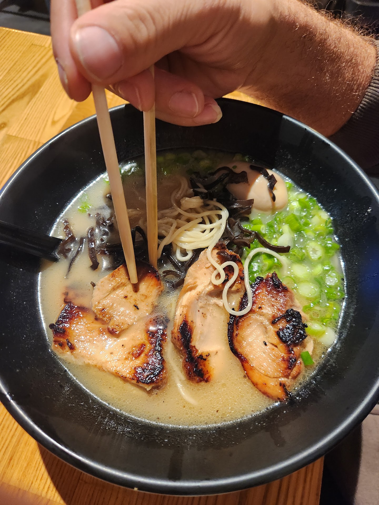 Ramen was too creamy and the quality of the pork wasnt great. Pork was 20% fat, chewing into the fat was unpleasant. The pork wasnt cut and I had a hard time trying to eat the ramen and other ingredients.