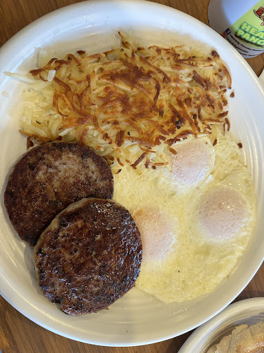 Me and a friend ordered similar things: an omelet with hash browns and meat (he got sausage, I got turkey bacon), a single order of grain pancakes with blueberries, and coffee. For my omelet, I got tomatoes, spinach, and green peppers. That was probably one of the most bland omelets I've ever tasted. Most other places in the area tend to use specific spices or sauces to give the taste a kick and make it unique, giving you a reason to return there as opposed to another location. But that tasted less than what the ingredients promised, notably due to a lack of salt. There was nothing special. It tasted exactly like something you can make at home for WAY cheaper. The hash browns were arguably worse because they tasted like a whisper of even a potato. We had to pour quite a bit of salt to actually get some flavouring out of it. The bacon and sausages (as well as the coffee) were practically the only things that actually had flavour to it.