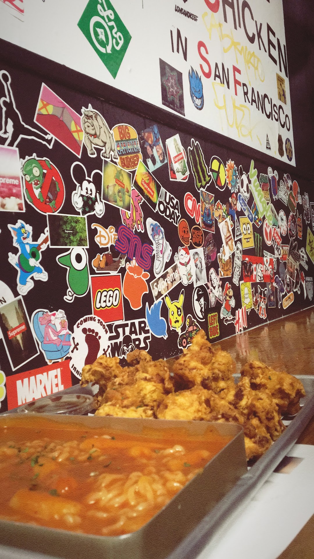 Thereās also a cool wall that the counter you sit at to eat faces, with lots of writing and stickers on it. I really liked it and found it to be very aesthetic.