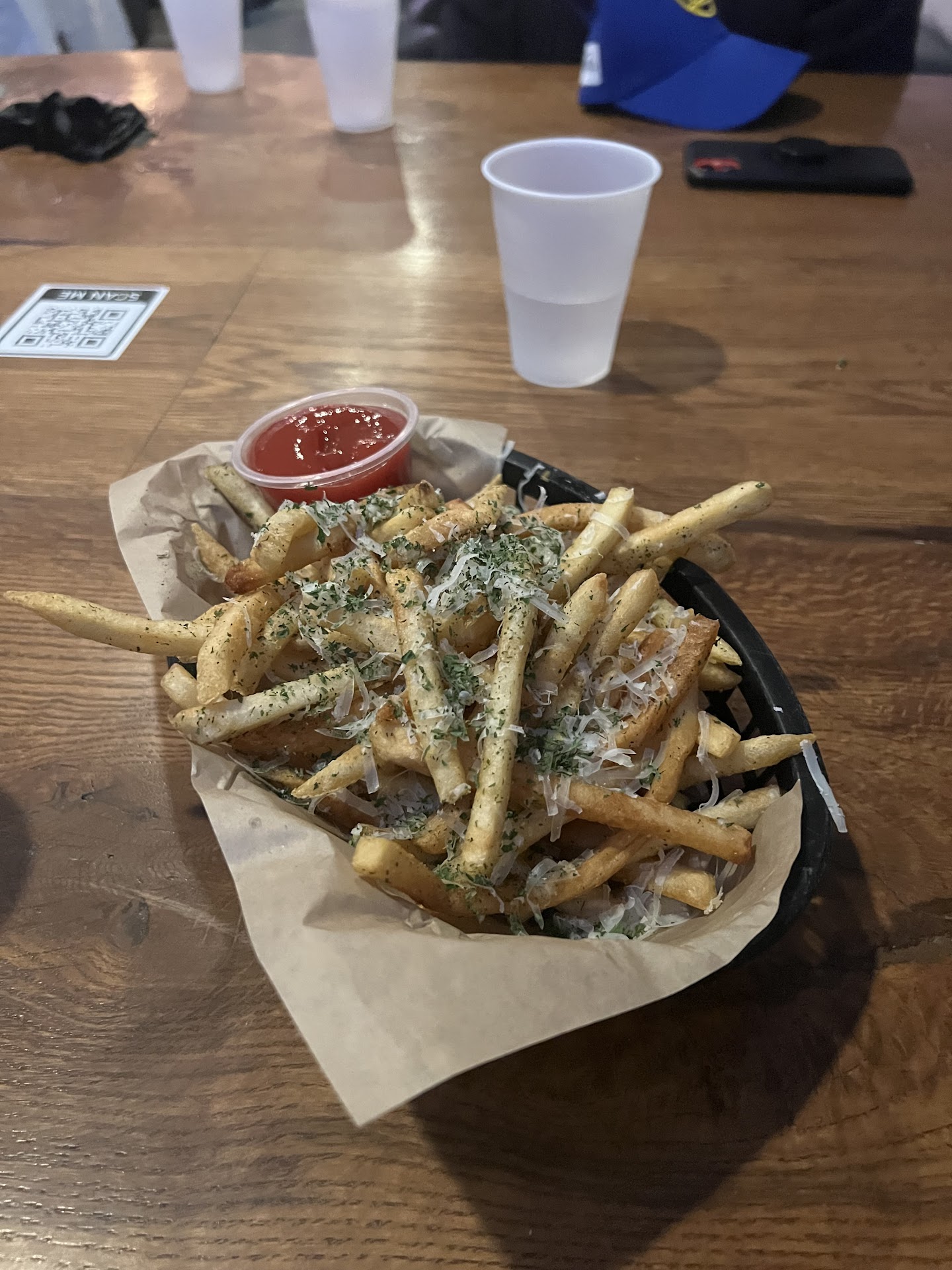 The fries with garlic parmesan are a must!!! And onion rings were good too. I would definitely order drinks at the bar, could take awhile if you order them from the table.