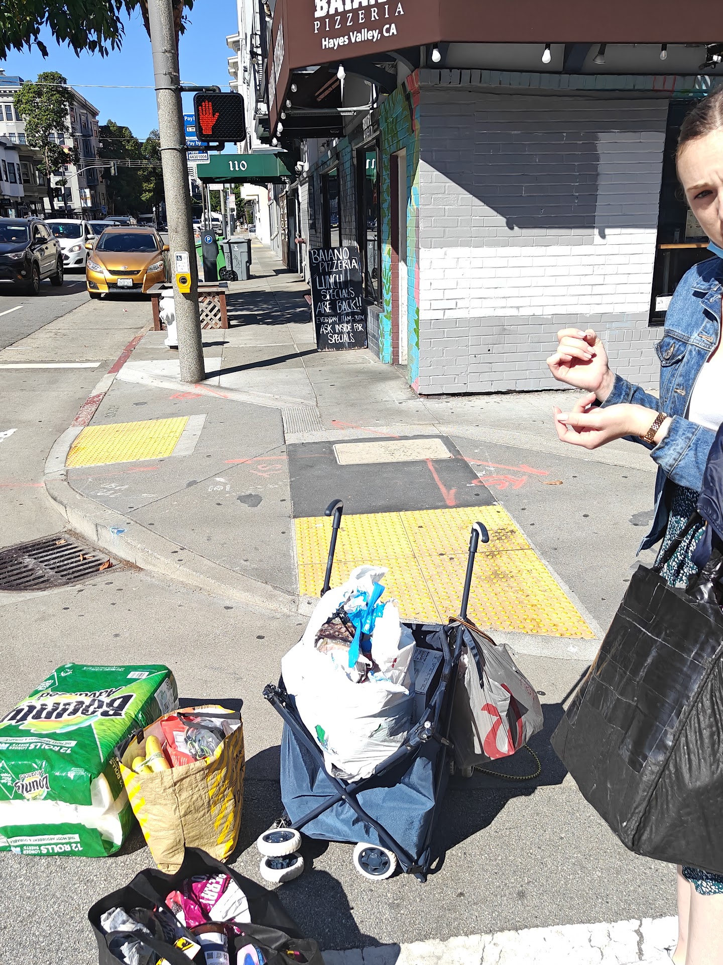 Please refer to the attached picture of my blue grocery cart with the right front wheel totally collapsed with all my bought items strewn over the curb in front of BAIANO PIZZA 100 Gough Street.
