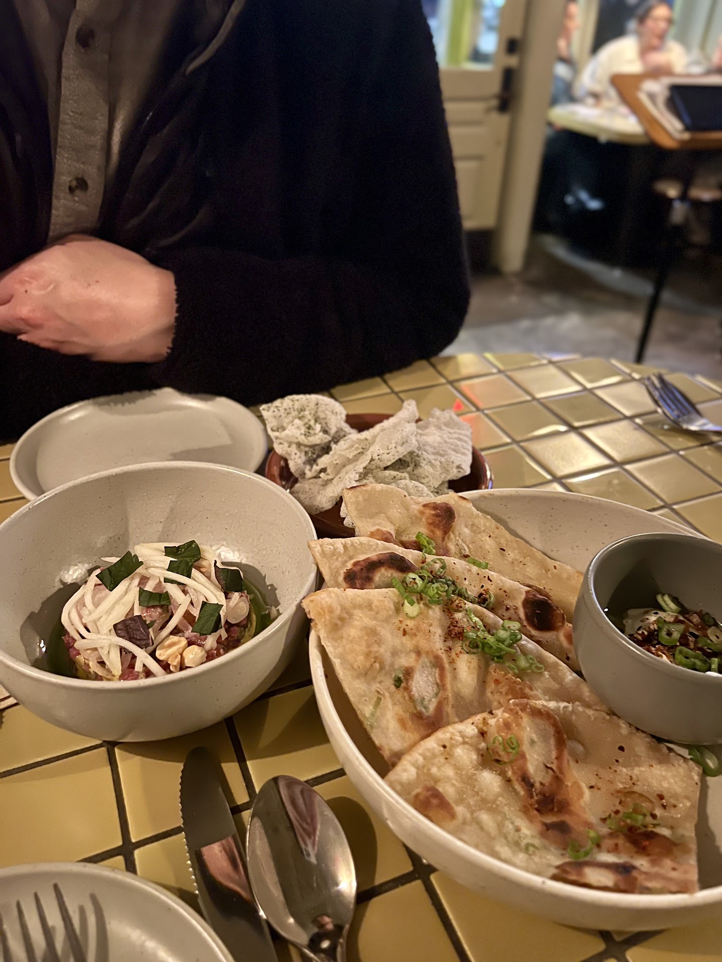 We kicked it off with the beef tartare (Szechuan peppercorn, kumquat, like, yes??), then tore through the house focaccia with whole milk ricotta. That bread was gone in seconds. The romanesco cauliflower was such a surprise hit - charred, nutty, saucy, crunchy - all of it. For mains, we got the strozzapreti with pork sugo (so rich and cozy) and the black cod pil pil, which was buttery, flaky perfection with these crispy potatoes I still dream about.