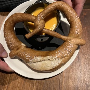 When we were finally seated, we were provided with menus which are two sided. The first side is the food which is served all day and the back side with drinks. It's not a big menu and we didn't take a long time to decide but that didn't matter, our waiter had disappeared. When he did emerge from whatever cave he was hiding in, he threw down waters and and vanished in a ninja puff of smoke before we were even able to order. When we finally ordered, we ordered a pretzel to start and our mains.