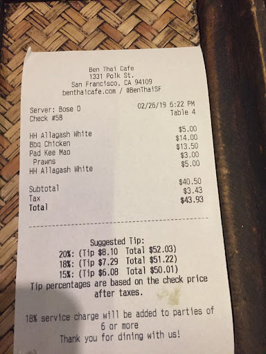Read moreOn a wet and rainy night, I dropped into Ben thai cafe on Polk , this is the second time I’ve eaten here. I ordered the pad me mao with prawns $16 rice noddle, broccoli, red peppers, snap peas , thai basil and spicy soy sce . Also the bbq chicken thigh marinated in lemongrass curry then bbq. All sounded great, the food came out in about 10-15mins ish which was great, service is friendly and quick in the small 25ish seated restaurant/ cafe. The chicken thighs are tasty but there is only 4 small thigh half’s on a bed of undressed lettuce with a small mixed salad garnish at the top of the plate with a squeeze of possibly Brought dressing as it was bland and mayo thickness.