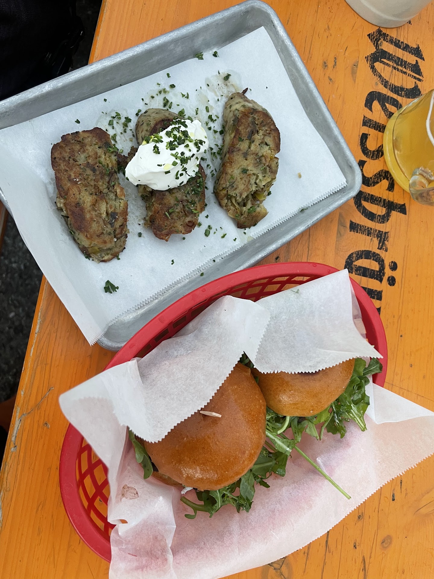 The food is tasty with makes sense being sister establishments with Suppenküche. The burgers are great! So goos that I just wish they were 3 times the size! Pretzels are always a go to as well.