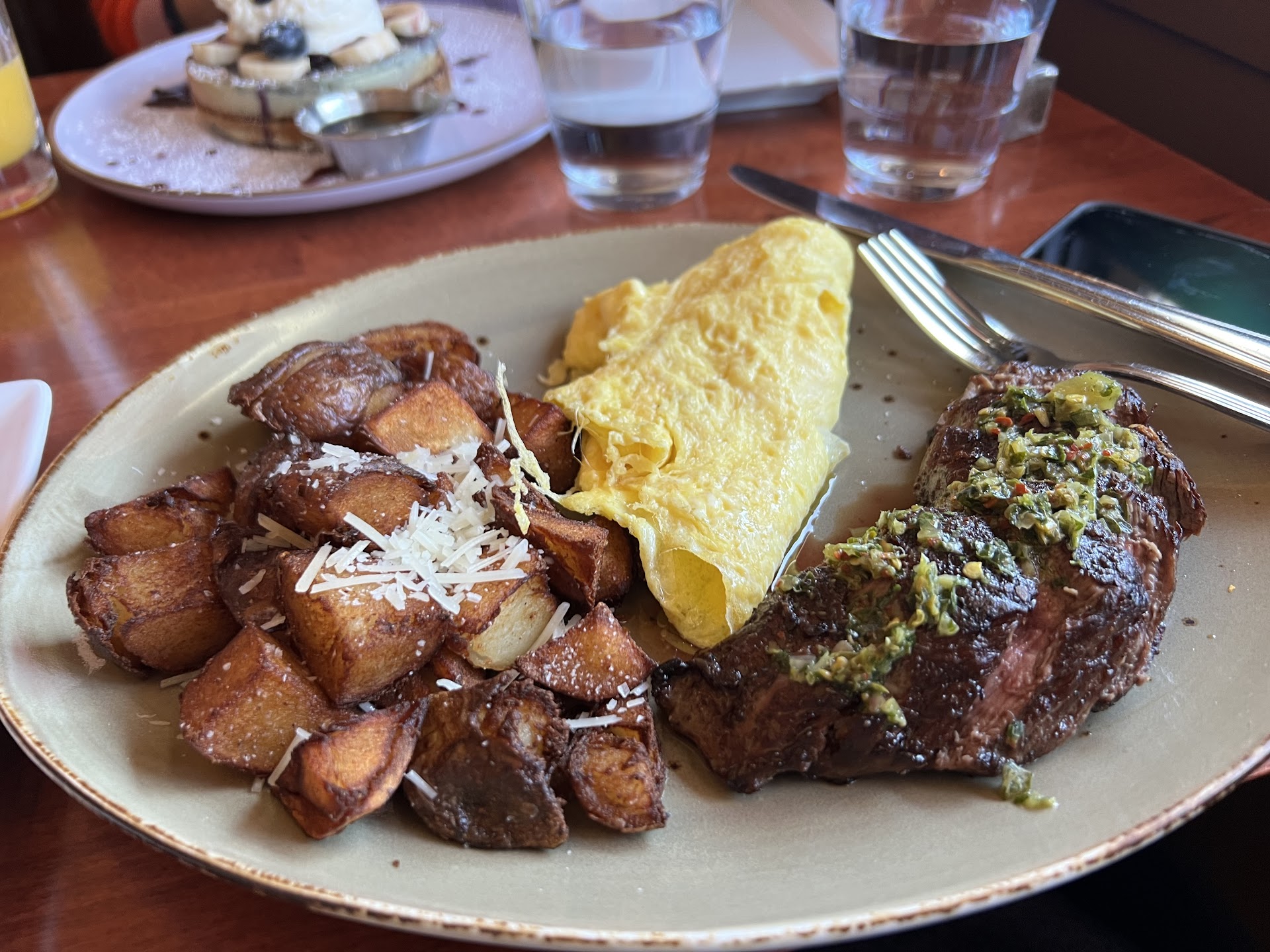 Read moreSearched up "saturday brunch" and found this place highly-rated. We found street parking so easy and went for walk in the Panhandle before our scheduled meet-up and eat-up booked via OpenTable. This is on the corner of a quiet residential area with very nice looking apartment buildings. I don't usually gush about brunch but this was really well done. 1) poached eggs for the Benedicts were well-cooked with runny yolks and soft whites; 2) steak with the chimichurri sauce was so delicious (whole 'nother level of steak and eggs); 3) roasted potatoes are excellent (usually they are left abandoned on our plates at a brunch, but we gobbled them all up); 4) ricotta pancakes were right-sized (one con: couldn't taste the matcha over the blueberry flavor) and had a nice texture. Only other con was that I expected the bellini to have a peach puree vs. syrup. The burrata salad was a little too sweet dressed with the ample dollop of fig preserve and I've had better fresh-oozing burrata. The service was very attentive and friendly getting our order in quickly before the 20+ table, serving us water refills and clearing our plates. The ambience is more in line with evening dining as it's darker seating inside with a fun light fixture on the ceiling and mix of leather booth and wood chair seating. Overall it is a 4.5 star (note: I...