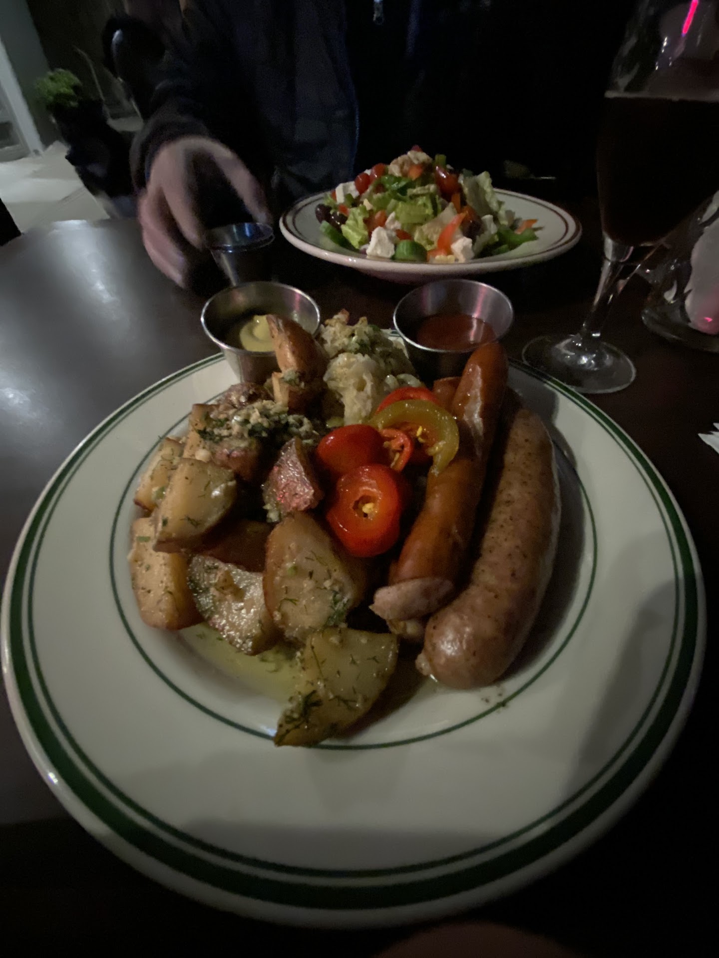 Great atmosphere bad food. I decided to come in here for an early dinner around 5/6pm. The atmosphere was very nice and had a good vibe. The bartender greeted us very politely and told us to sit anywhere. We ordered a hummus plate as a starter. This was an incredible tasting appetizer with some of the better hummus I’ve had. The pita had some black grill or oven soot on top but it wasn’t a big deal and it was still fantastic; the olives, cherry tomatoes, and cucumber were all very fresh and tasty. For a main dish I ordered their basic burger. My food came out in a timely manner and presentation wise it looked great. The fries were indistinguishable from McDonald’s but in a good way, they hit the spot! The burger on the other hand was one of the worst I’ve ever had. The patty was inconsistently cooked with pockets of pink but large sections closer to medium well (ordered medium). The patty was very fatty and chewy eat bite taking at least a minute to get down. The bun was also toasted poorly and chewy as well. The biggest offense though was the produce. The tomato slices on both burgers we ordered were very much not ripe, the pickles were discolored and tasted rather old, and the lettuce was also chewy and had specs of black all along the edges (not consistent with usual wilt). This seems like a great social place to get drinks and appetizers but if you want a full meal I’d recommend you...