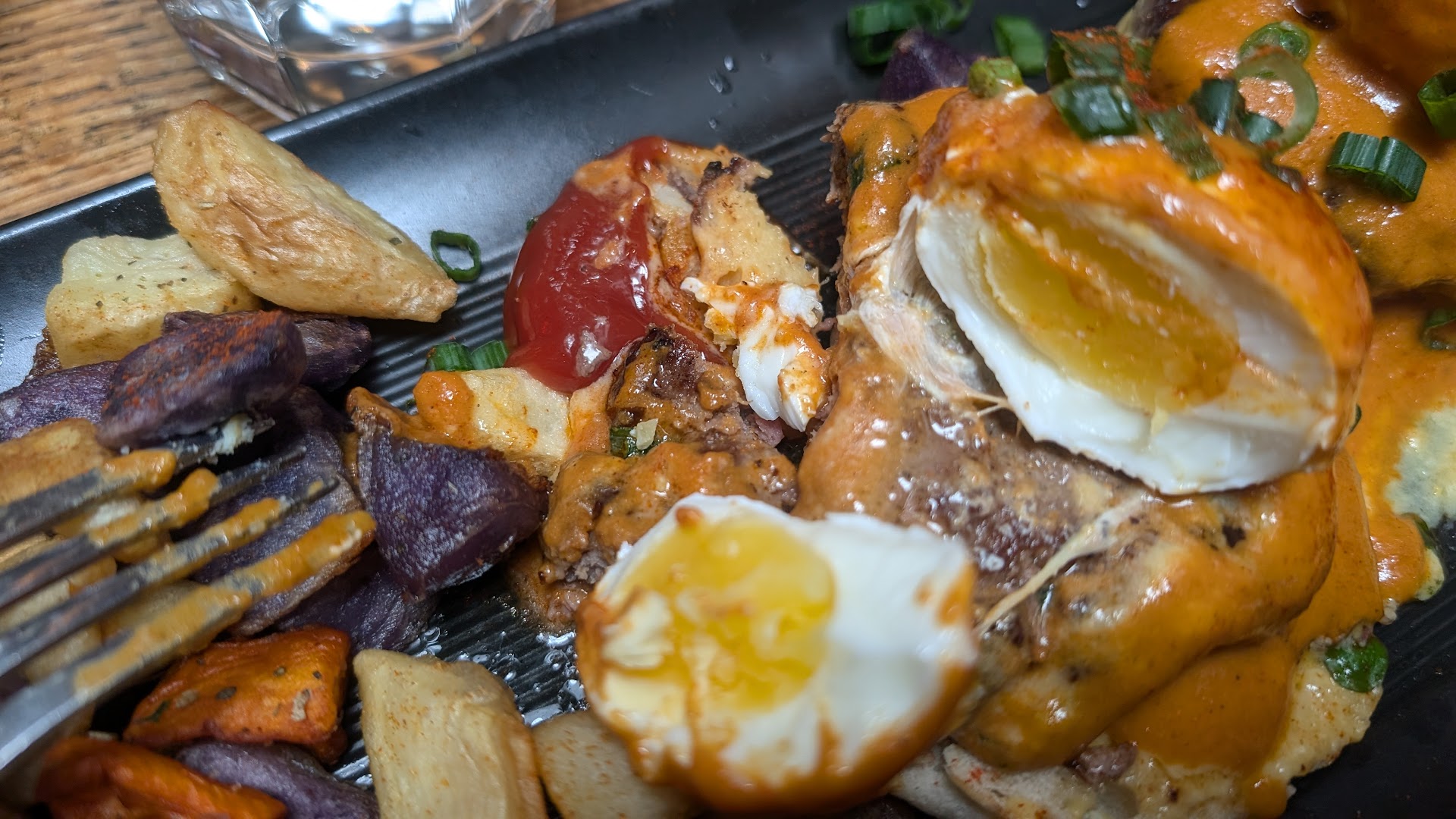 Everybody in my party ended up ordering a benedict. I wasn't too eager to eat asparagus and the Millionaire's Bacon, so I ordered the BW Benedict. At $15, it wasn't too bad for the quality of food that I got to eat. The Blackstone Benedict has 2 asparaguses lining the poached eggs as it rests on top of that Bacon. My dish had a pork wine sausage, mushroom, cilantro, crispy yam, and Thai chili hollandaise sauce. It definitely looked unique when it came out of the kitchen and was really tasty. I don't think I've ever tried pork wine sausage in a Benedict dish before, so it was an interesting and tasty twist on the classic Eggs Benedict. I loved how after breaking into the egg yolk, it would gently spill over onto the sausage and Ciabatta toast, making that entire bite taste truly amazing when eaten together. The sausage was slightly sweet, and with the saltiness of the egg yolk,crunchiness of the toast and the garnish, and the slightly sour/salty taste of the hollandaise sauce, it was something that wowed the taste buds. It also came with rainbow potatoes and a small salad. The salad was okay - just some greens and a vinaigrette sauce on top. The potatoes were much tastier - they were a mix of yams, potatoes, and purple potatoes, slightly fried on the outside, but still soft on the inside.