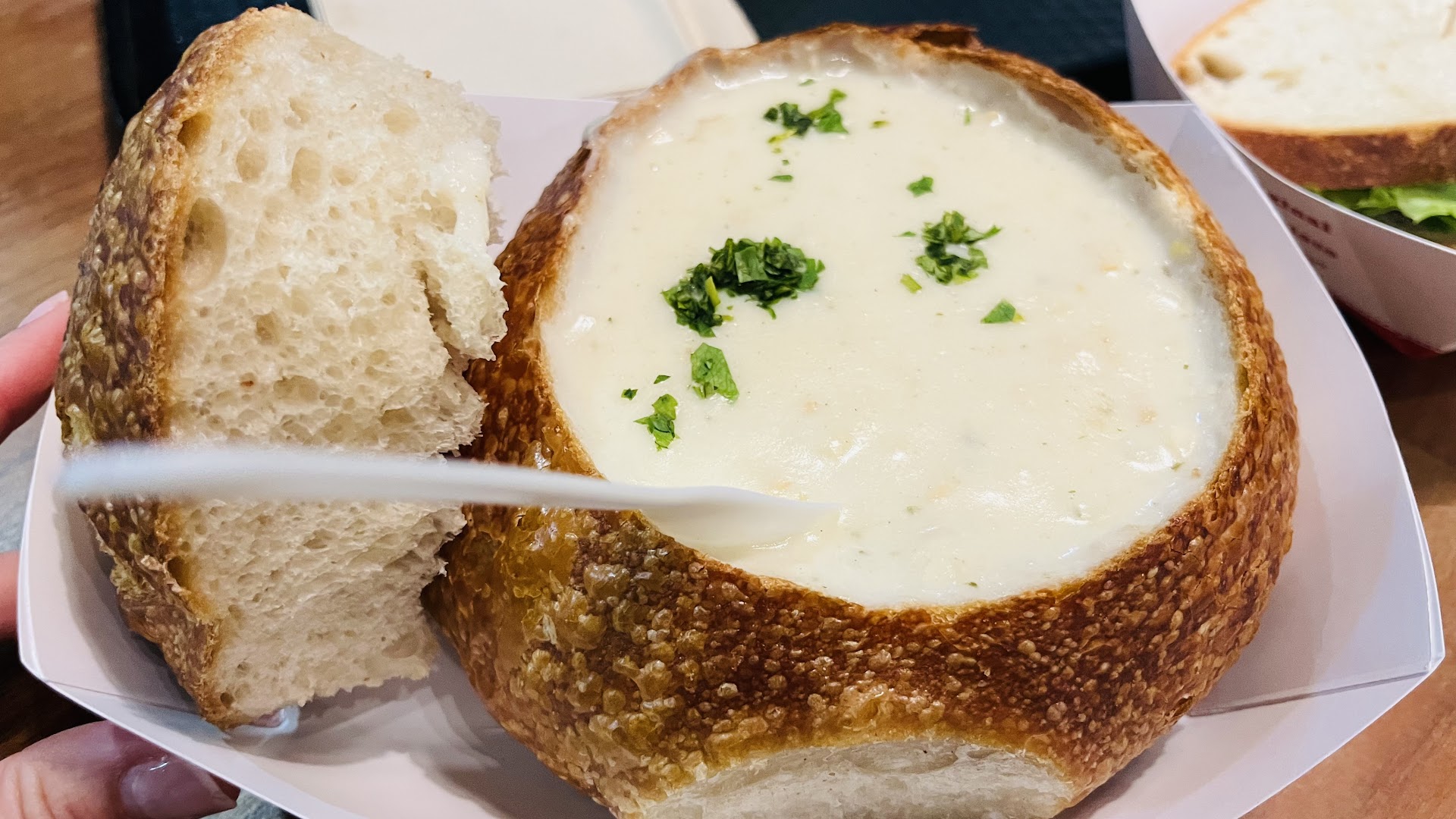Clam Chowder in a Sourdough Bowl A must-try at Bistro Boudin is their iconic clam chowder served in a freshly baked sourdough bread bowl. The chowder is rich and creamy, brimming with tender clams and hearty vegetables. The sourdough bread adds a delightful tang and texture, making each bite a comforting experience.