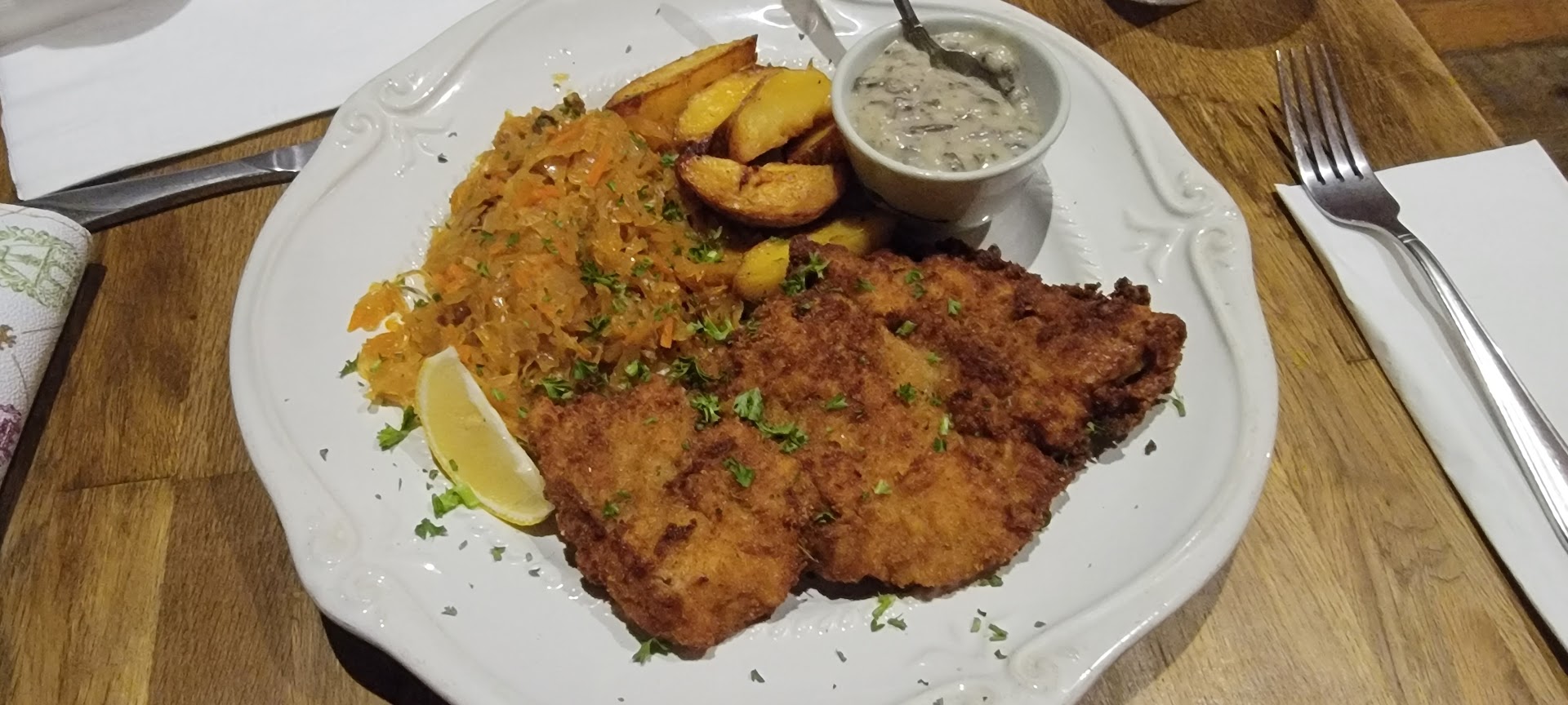 So I have a lot of experience with Central European food having been married to a czech and dated and am currently dating a Slovak. Basically 15 years of my life with Slavic people and have visited czech and Slovakia has two mother in laws cook for me non stop (lucky). I had mushroom soup (it was okay not great but okay), my partner did not like the soup. My main course was the cabbage roll which was good and tasted homemade. My partner had the chicken schnitzel which was good but a very simple dish nothing special about it.