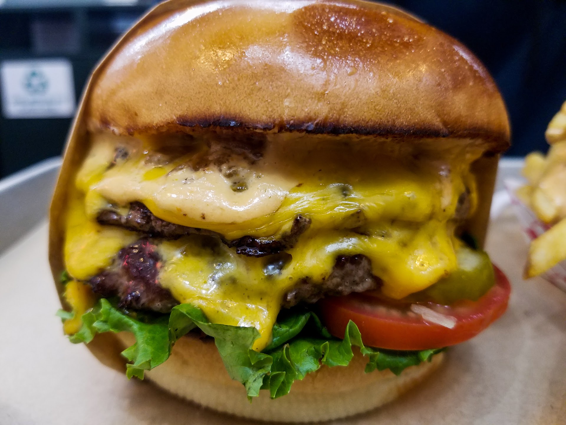 Read moreGot takeout. Single burger with American, veg fries, bottle of Coke. To be fair, it was hard to find parking on a Sunday afternoon and by the time the food got home, the fries were soggy and the (single) lettuce leaf on the sando was limp. The high point was the bun. It was soft, yet hearty enough to stand up to the juiciest patty. Unfortunately, the beef was fairly dry and was cooked all the way through and then some. Maybe if they formed thicker patties, this wouldn't be an issue. I also ordered cheese and didn't get any. The sauce was decent, but there was barely any of it. It could have used some pickles or some kind of cooling tang to break up the salty monotony of meat and bread. Their ketchup is housemade, and while I applaud the effort, it had WAY too much celery salt. I'm giving them three stars for freshness and effort, but there are far too many burger places doing arguably much better fare. Too bad. These guys are close to my home. Not worth almost $40...