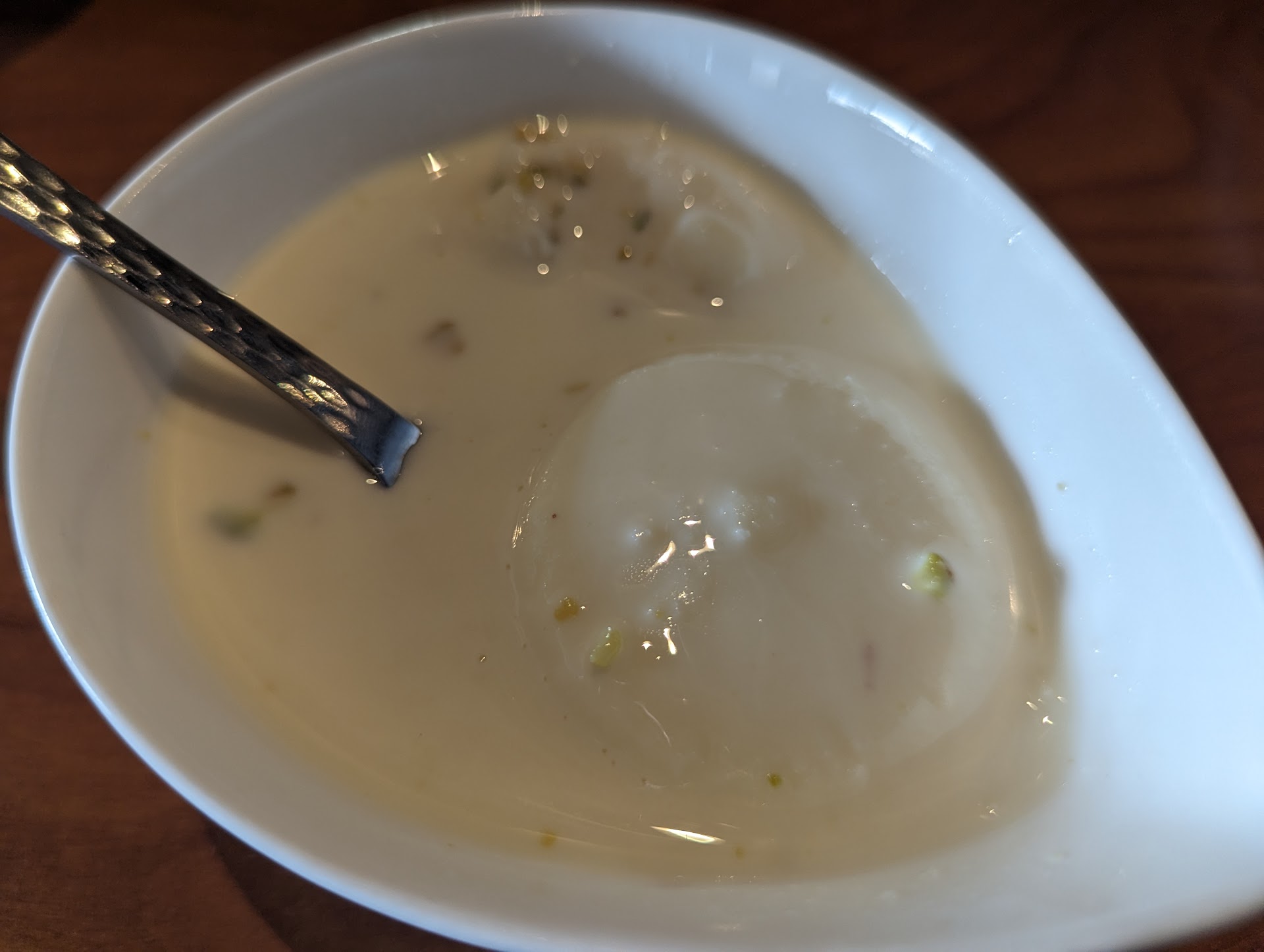 I also ordered mango lassi ($4). It took a few minutes (I was told that they were making it fresh), but it tasted great once it arrived. It wasn't overly sweet. I had no idea what rais malai was, and it turned out to be some sort of cheese puck in a delicious sauce that tasted like coconut milk and rose water. It was great.