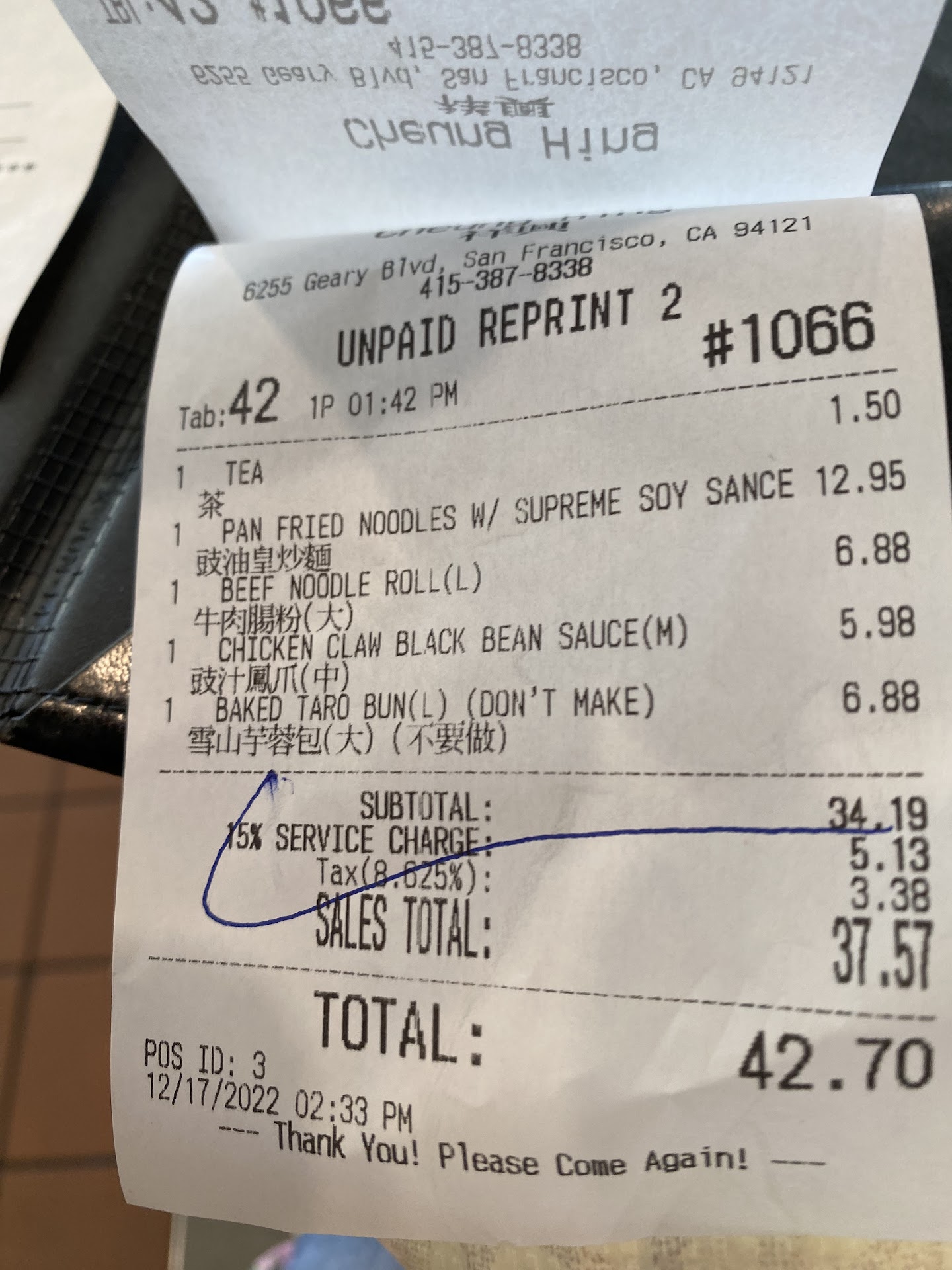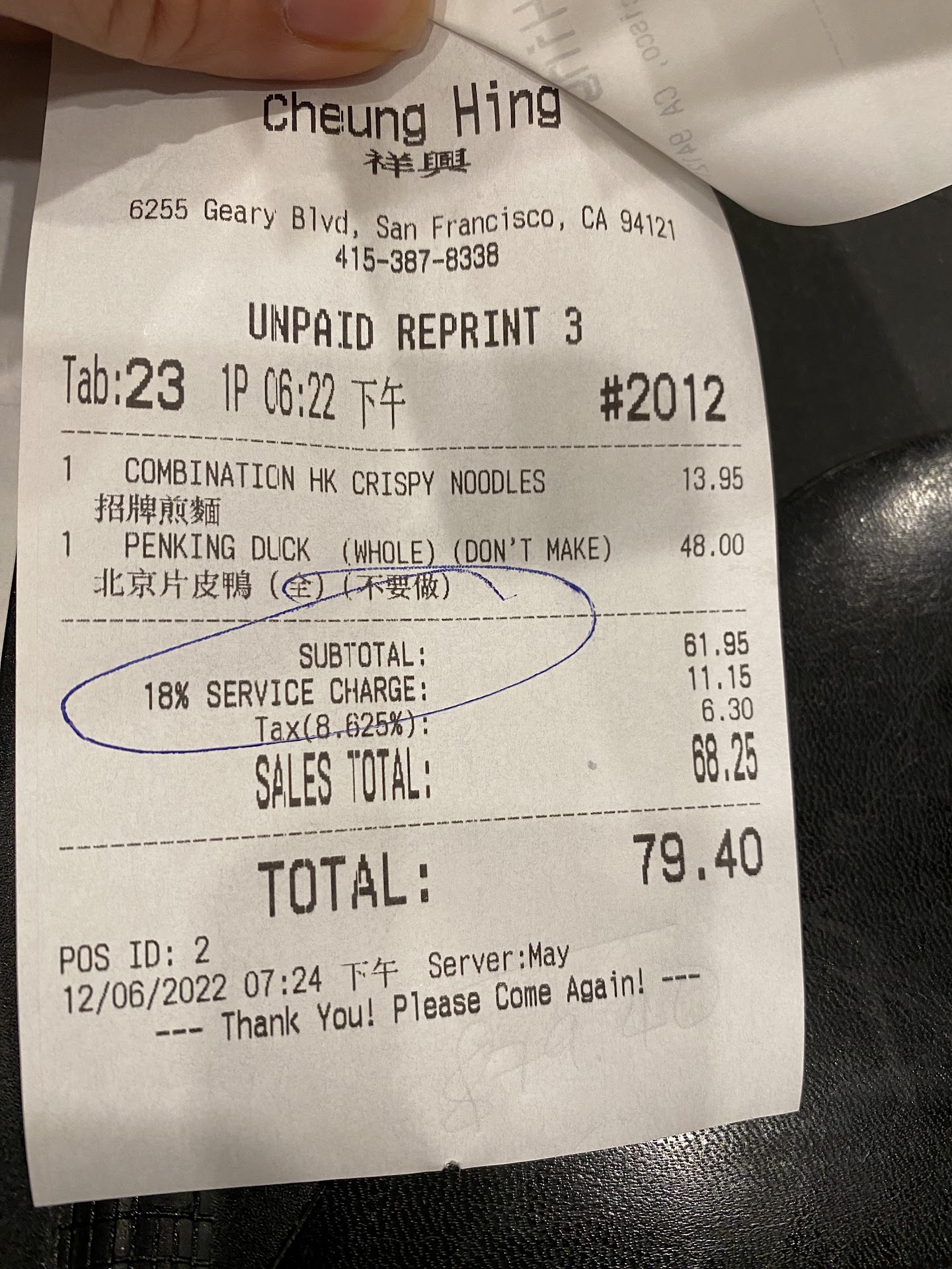 Read moreUgh. I hate to post sub-par reviews but I feel like it’s a PSA to let you all know there is a automatic 18% gratuity service charge already added to your bill. To be fair, they did circle it on the second receipt… Coming from decades in hospitality industry, I always start from 20% gratuity in mind. As things fail, I lower it accordingly. I would have considered 15% generous but 18% was their mandatory minimum. The 1st star given is due to the fact they actually had real Peking duck available (without having to preorder). 2nd star because everyone’s having staff issues and you could see they severely needed at least one other person to service their dinner crowd. 3rd star for the food was good but not as expected nor great. The Peking duck’s skin was shaved off (else, it’s just roasted duck) but not crispy. The cut pieces had shards of bone throughout and was hard to easily make and eat your Peking duck bao/bun (sans bones and shards). The 4th star fell off due to really painfully slow service all around- from entry, wait to be acknowledged and seated, wait to take our order, not giving us peanuts with our tea (as observed at other tables), having to ask for Togo containers, having to then ask for our check (was incorrectly charged for 2 half duck @$28 ea vs our whole duck @$48) and getting the revised check, and then for them to process my credit card. Then to add insult, we saw other customers received a nice complimentary dish of mango pudding, and we were served red bean soup. Disappointed and feeling profiled, even though Asian and able to speak/understand Cantonese, we will not be...