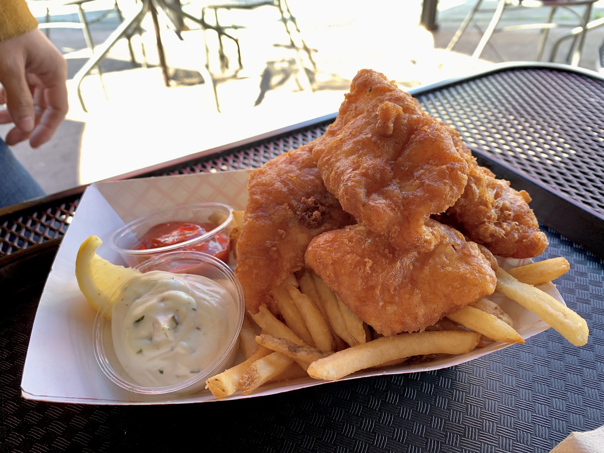 Everything was freshly cooked, and accompanied with wonderful fries. Clam chowder was thick and appropriately creamy, the crab melt was delicious with "real" crab meat, chicken tenders were great for the kids, all with plentiful local beer. The amazing weather also added to the atmosphere.