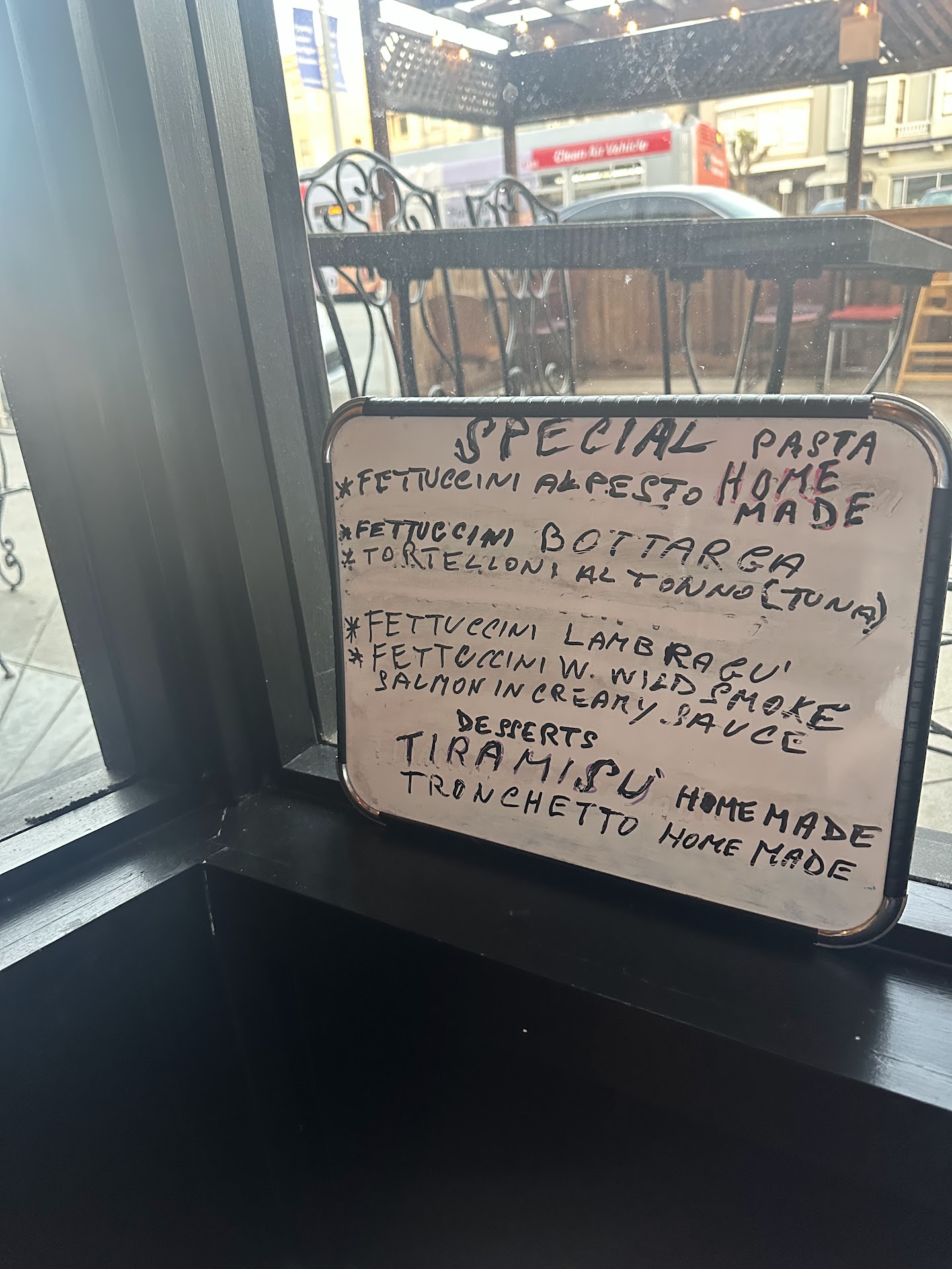 Wine: Great selection of Italian wines. I'm certainly no expert, and the staff was helpful in guiding us. Appetizer: We started with the prosciutto and burrata, served with some bread. It was simple, fresh, and so satisfying. Mains: We shared the cinghiale (wild boar pasta) from the regular menu and the bottarga special. Both were rich, flavourful, and filling. Dessert: It was hard to choose just one, so we split the tronchetto and the pistachio cake—neither cake was too sweet and both were delicious.
