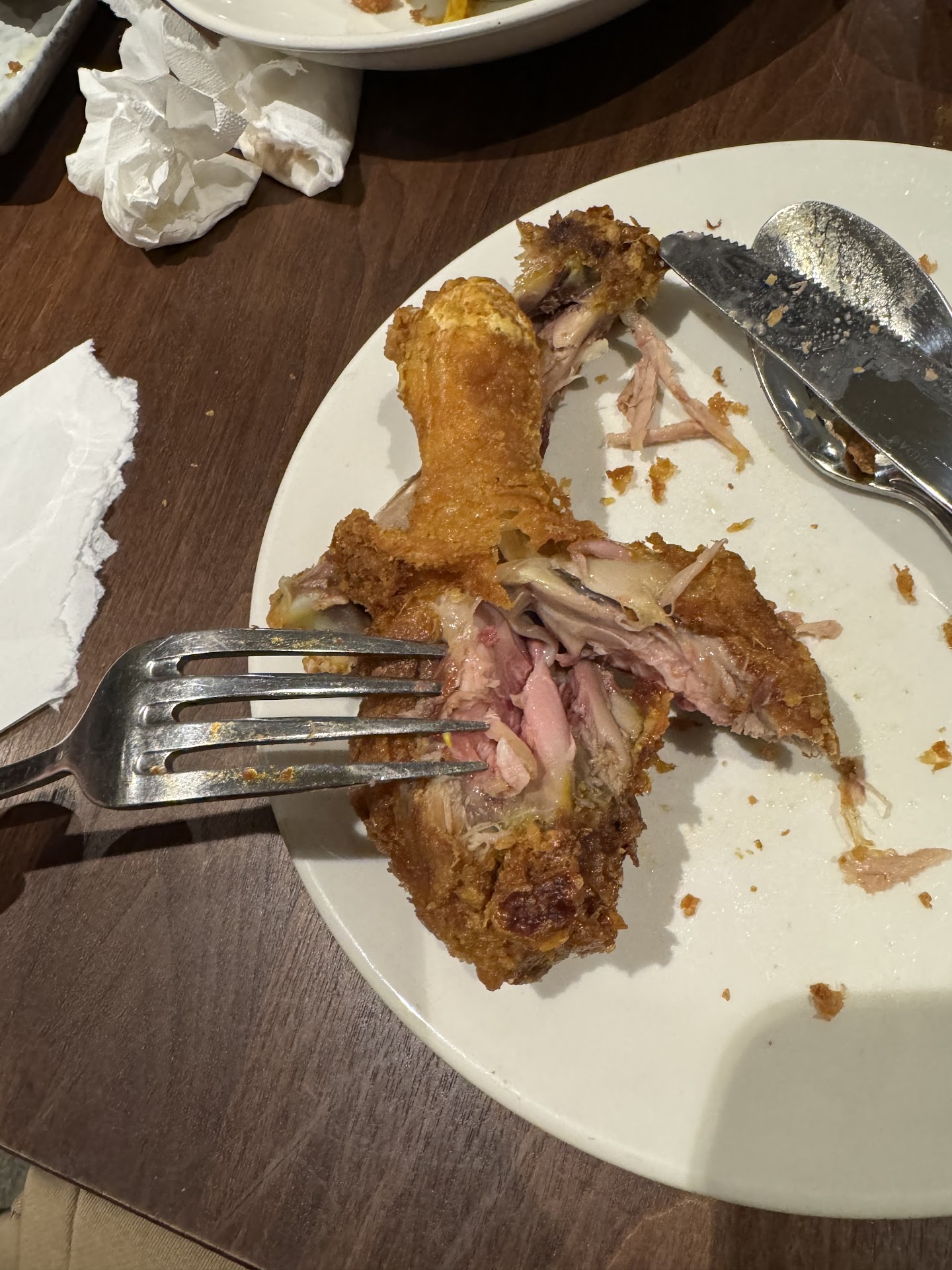 First bite into the chicken, it’s tasteless. Absolutely no flavor and that piece was pretty overcooked. I take a bite of a second piece, and it’s raw and bright pink inside. I instantly feel really disgusted and notified the server. No apology, just basically said I’ll get you new ones. We wait for a bit and the new chicken arrives. I cut into it, and it’s even more raw than the first piece. Bright pink, with pink juice flowing out, and the meat sticking to the bone. At this point I’m mortified and I let another server know. This time she was apologetic and offered $10 off and remake the chicken a third time. At this point, I have no faith in this restaurant and I just wanted to leave. You would think after the first complaint of the chicken being raw, they would be more careful and temp the chicken but getting it wrong 2 times in a row is unacceptable. How can one piece be overcooked and the other be raw? Pick a struggle already.