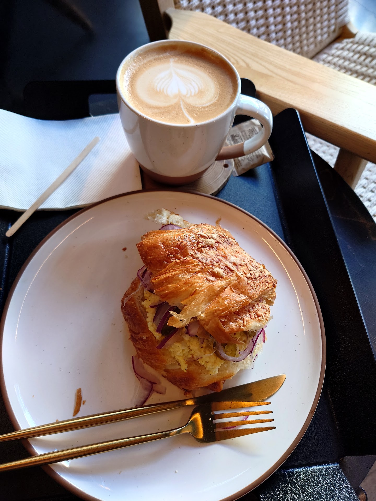 The breakfast sandwich was excellent and inventive - served cold on a very good cheese croissant, It's primarily lovely fluffy egg salad on a little stack of fine ham and topped with pickled jalapenos & onions which add a nice freshness and crunch. Oh - and it's huge: I had to take a break midway through.