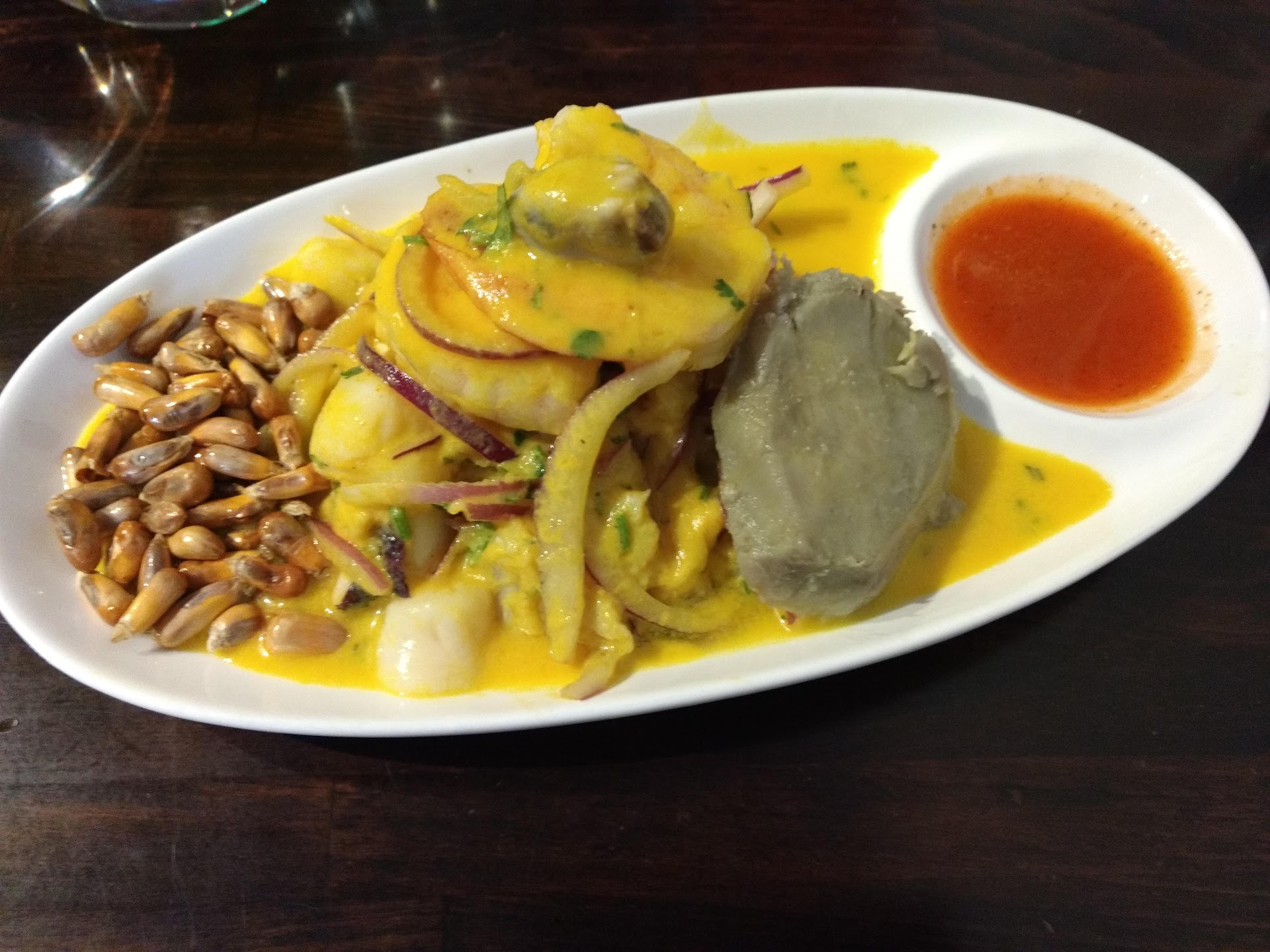 Arroz Con Mariscos has a handsome amount of seafood (about 45%) and deliciously sticky and jumbo Peruvian corn kernels.