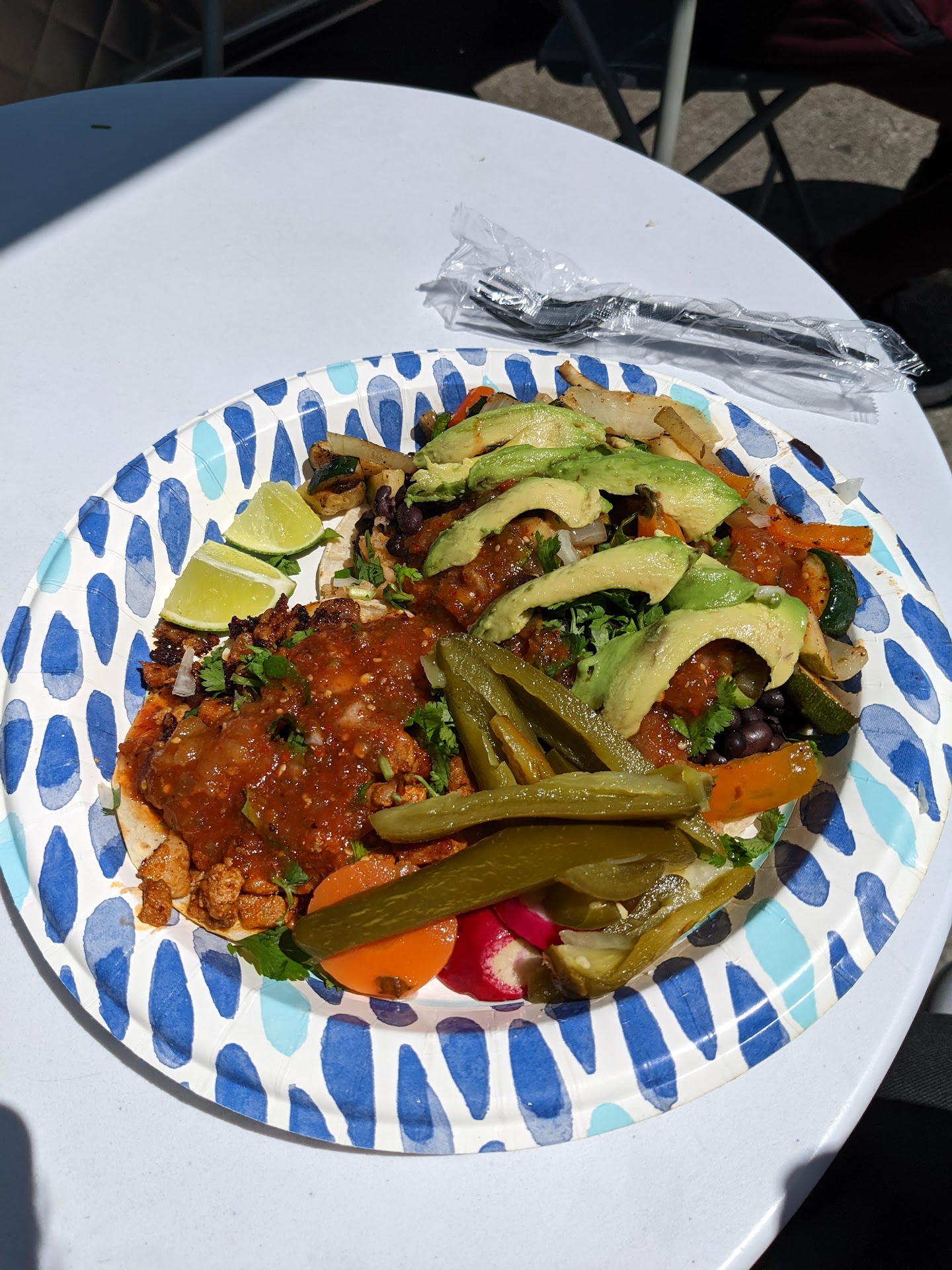 Great tacos at great prices. They set some folding tables up front so you can sit, eat, and drink a Jarritos. The woman who I ordered from was super kind. The al pastor was delicious, tender and well seasoned. The vegetarian came on two tortillas and was a bit more like an open-face burrito, with rice, beans, zucchini, peppers, and avocado. The hot red salsa on top was spicy and tangy, but the real highlight was the pickled veg on the side. The jalapenos are perfect, spicy and not too acidic. $7.50 all together. Loved it and will definitely stop by to try more- I have my eyes on...