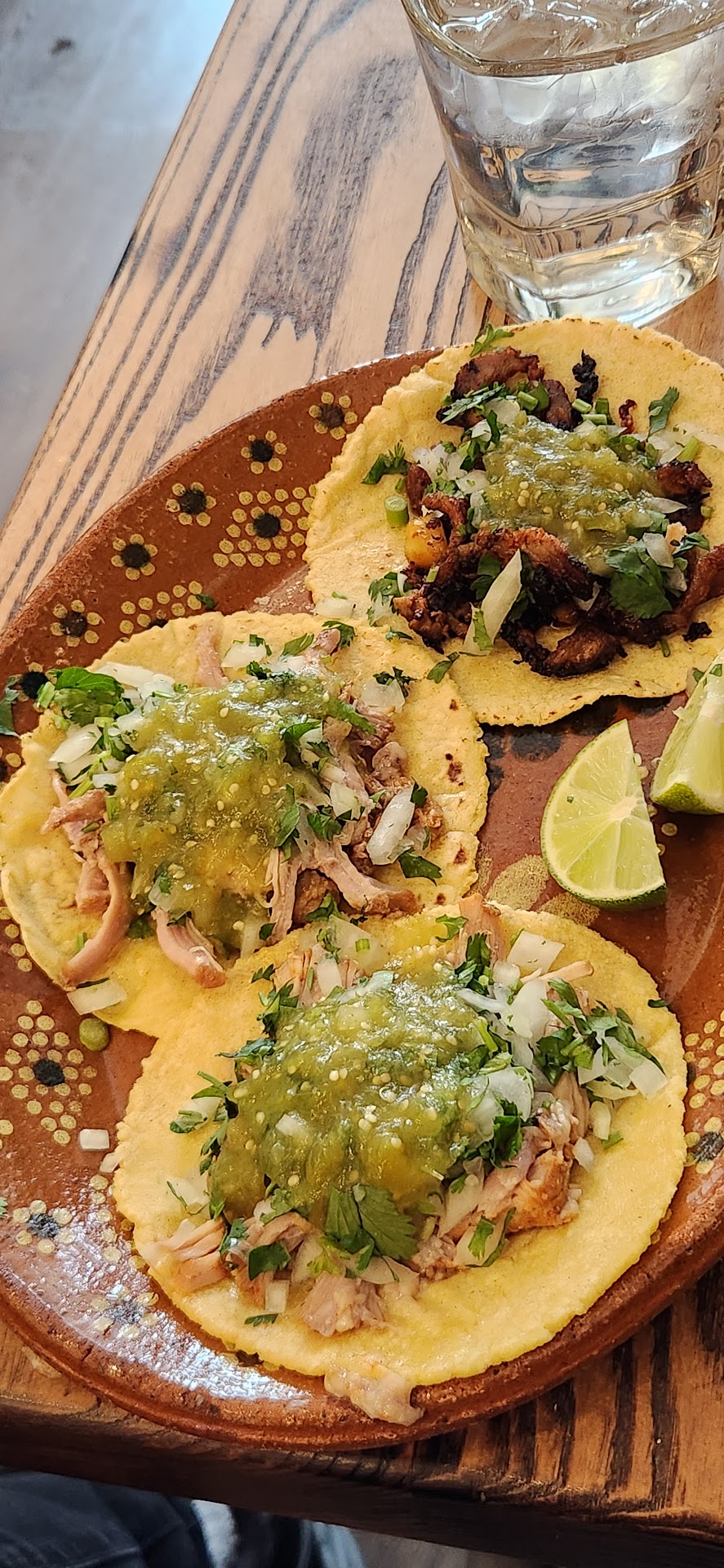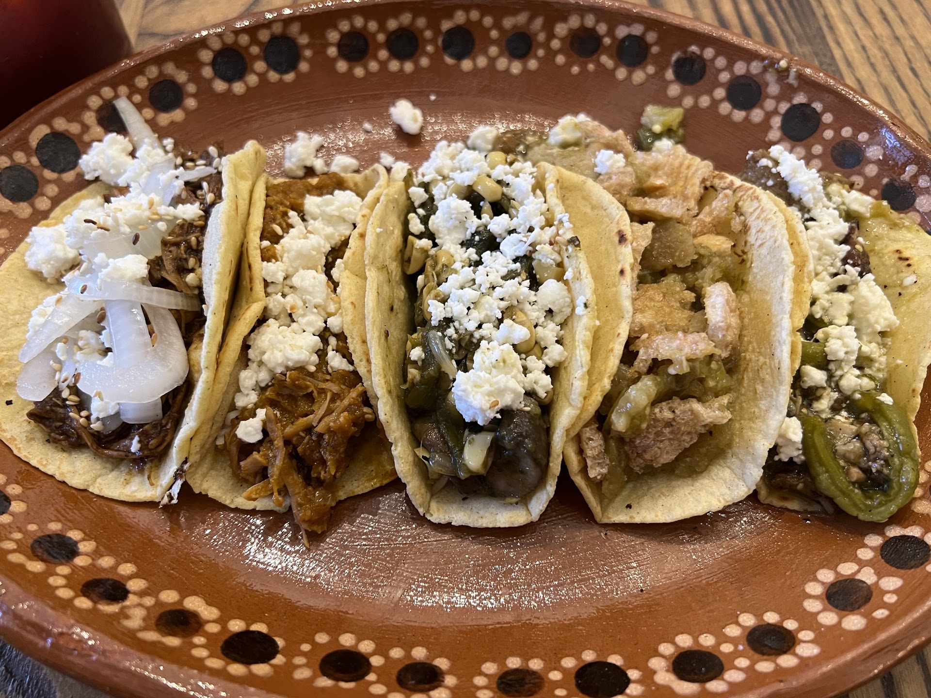 Vibe: Think cute sit down restaurant but with taqueria prices. The attention to detail for decor was excellent. Aesthetics were beautiful and the place had a really cool vibe to it. Tacos were served on hand painted clay plates and drinks came in traditional blue rimmed glassware.