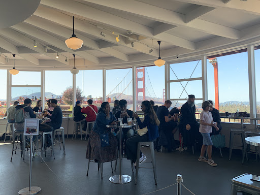 Beautiful coffee shop by the edge of the Golden Gate Bridge. Nice people, nice atmosphere, nice view, and nice food. My hot chocolate was a good balance of creamy and chocolatey. The quality was good. The whipped cream was also the thick kind that you scoop up… very fancy.