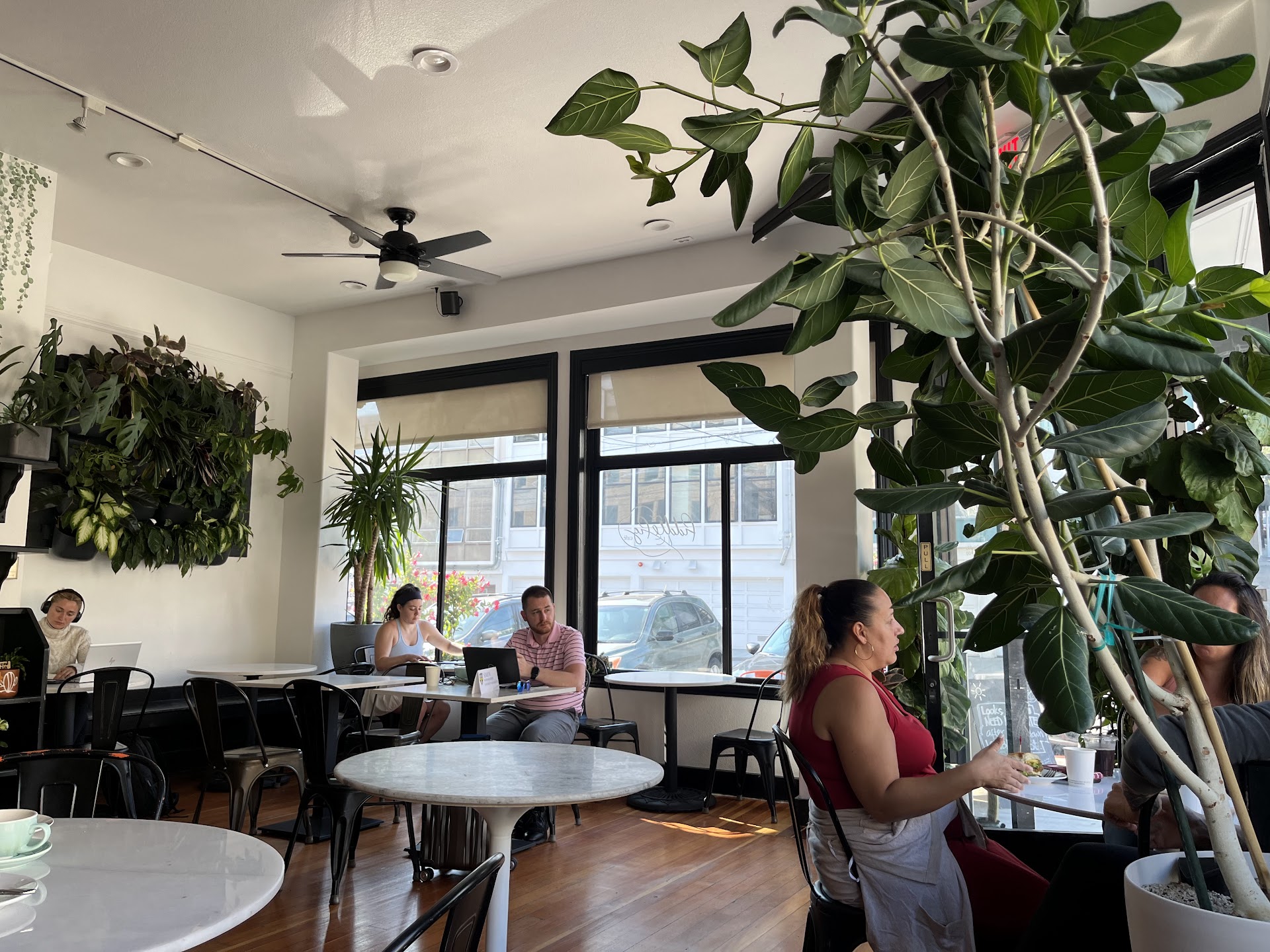 Read moreThis place is so cute! Stopped here for breakfast and to work for a few hours, and it was pretty easy to find a seat by the wall early in the morning. It got a bit crowded later during the lunch rush, so I recommend stopping by outside of rush hours to grab a seat with an outlet. There were a decent amount of plugs but not enough to serve every table- pretty expected! The music was great, the servers were nice, and the general vibe was sit back, chill, and enjoy the surroundings. It was easy to stay focused on work with no major distractions. For food I ordered the breakfast sandwich and at first glance I was doubtful, as it visually resembled the microwave sandwiches from Starbucks. But wow, looks can really deceive. The sandwich was DELICIOUS and had the perfect texture - I think it was one of the best breakfast sandwiches I’ve had in San Francisco so far. I can’t recommend it enough, in fact I’m worried about not being able to enjoy other breakfast sandwiches during my trip! If you’re a visitor like me, then I recommend taking an early morning cable car out to Lombard street, checking out the crookedness, then walking down Lombard street to this cafe. A nice little combination of touristy stuff and...