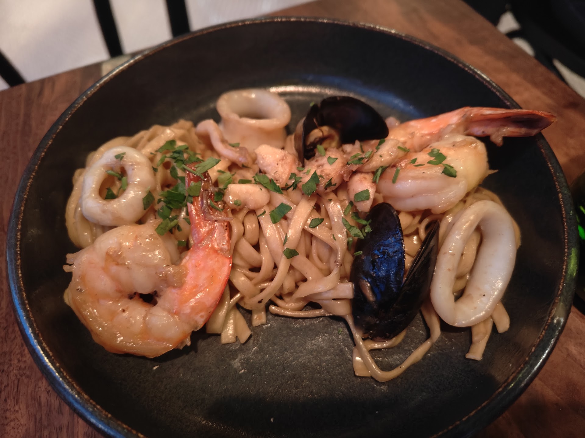 The food was very tasty. Very much small plate vibes, but they do have a few entree sized potions, including the seafood linguine, which we loved.