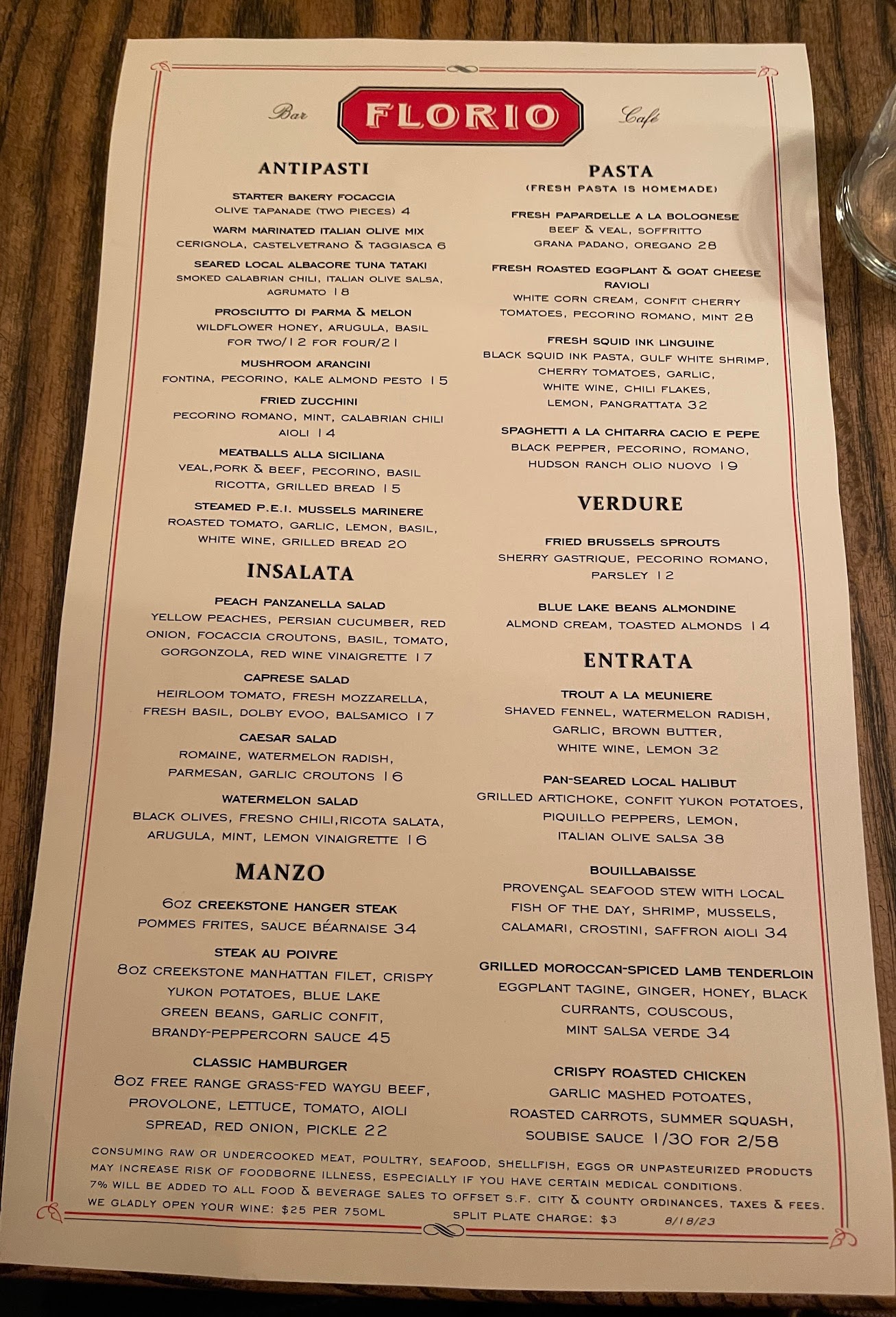 What a lovely restaurant! I cant say enough about Florio bar and Cafe. We had an amazing dinner for two, we had the Dungeness crab cakes as a starter, we both went with steak as the main entrees, filet and a New York, both were amazing. For side we went with asparagus and the Brussel sprouts, to which both were very tasty! The wine menu was nice with some savory local pinot noirs available! For dessert we have a chocolate dish and a caramel dish which were both handcrafted and absolutely to die for, just the right size serving and packed with very high quality ingredients! I have to tell you that the separator was not the food, which from my description you can see that we really enjoyed it however our server Josh was 1st class! He was on point, accurate and very professional. We have enjoyed many nice restaurants in San Francisco and I will tell you this is at the top of the list!. What you can expect is unbelievable service in a quaint, semi dark yet warm atmosphere. You will certainly enjoy your meal as every element of the meal was truly perfect! I do not give a lot of 5 stars because most of the time something could be better but I will tell you our server Josh paired with this wonderful dining experience put my 5 star rating over the top! Anybody that knows this area knows that you have many choices for dining on a wonderful street packed with wonderful boutique stores, I will tell you that you cannot go wrong here and would recommend this eatery above all...