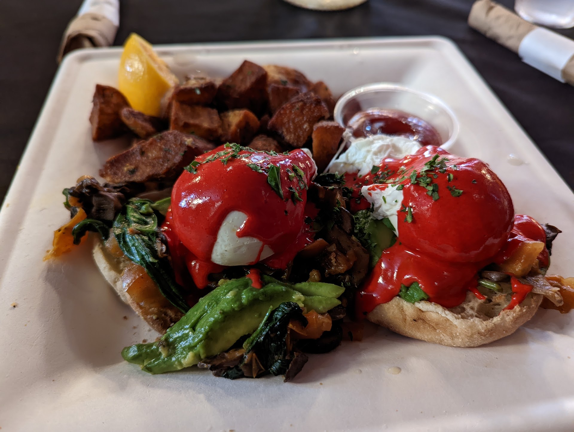I ordered the Bennie with Seoul, which was a soju fried chicken with a gochujang hollandaise sauce. It was delicious! The chicken was fried beautifully, and yet it didn't seem heavy. The eggs were perfectly poached, and the hollandaise was yummy. I'm actually not a fan of pickled onions, but I really liked it with the chicken. It gave it a nice acidity. Speaking of which, I ordered a pineapple juice, so I think that also helped lighten the meal. The dish also came with potatoes, ketchup, and an orange slice. The portions were just right.