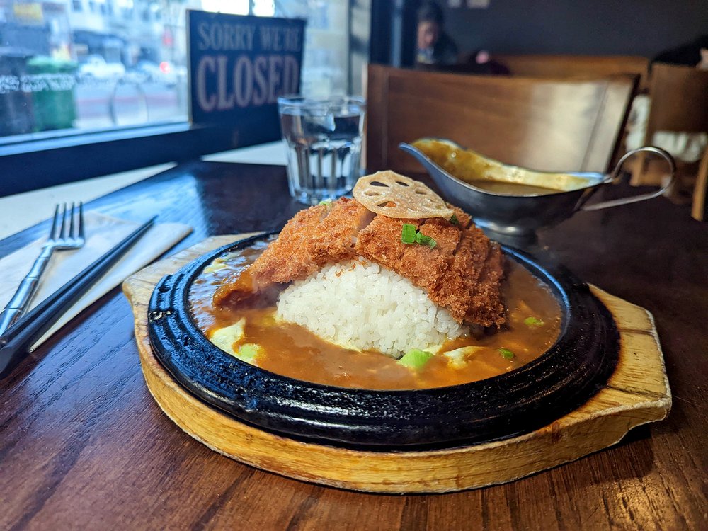 Your dish comes out of the kitchen with a plume of steam. It's a cast iron skillet, with an egg frying on it, with rice and your breaded meat or vegetable of choice on top. (I recommend the chicken katsu.) A gravy boat full of Japanese curry comes on the side.