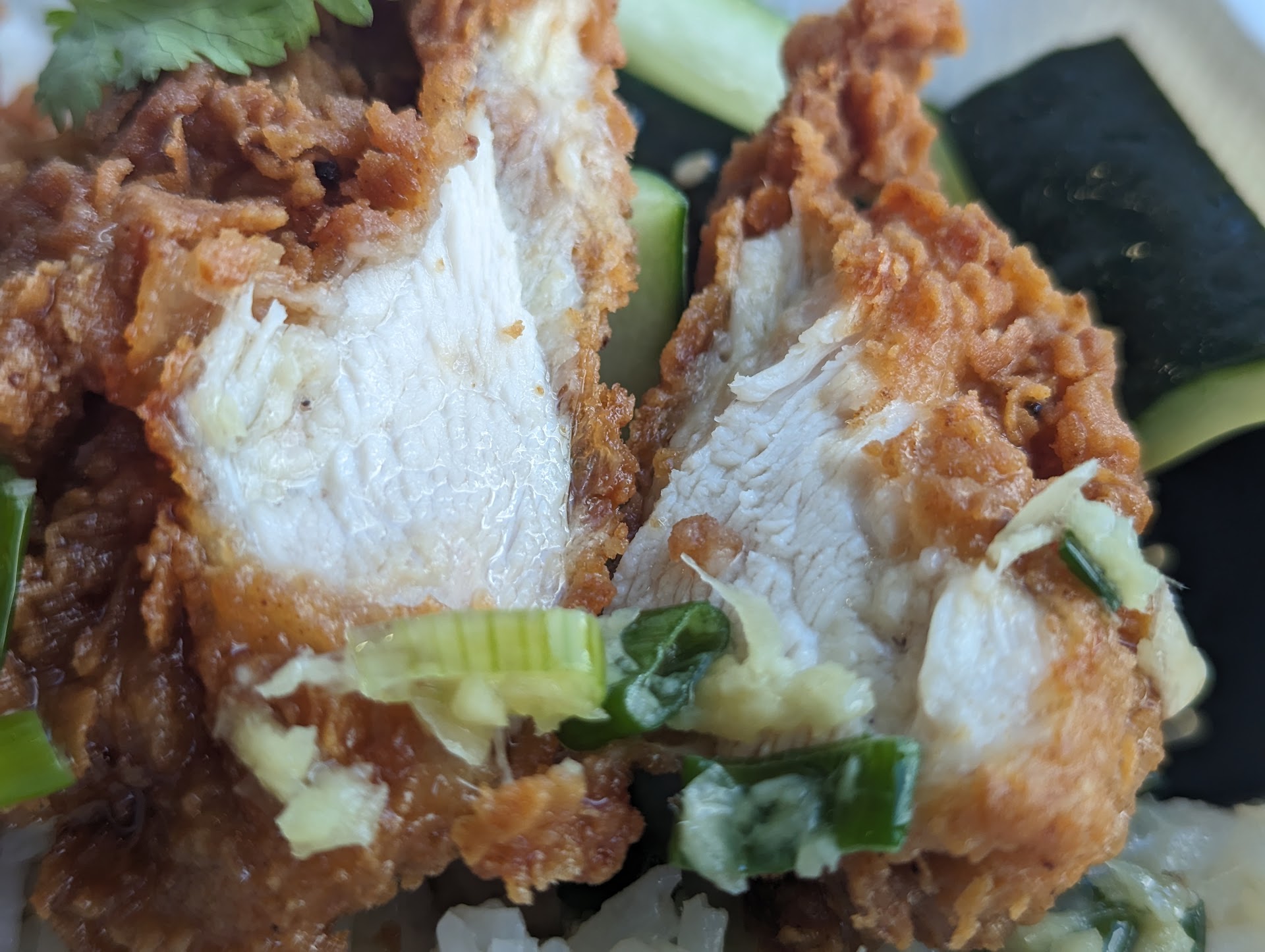 I had the Crispy Gai ($15.15 after tax, before tip), which was done about 12 minutes after ordering. I chose Hainan sauce for my sauce. The chicken was tender inside and crispy outside, and tasted great, which is what I expected. The rice was perfectly cooked. The sauce was minced ginger and green onion in some oil. I thought that half the container was plenty. The chicken broth tasted like real chicken, not like bouillon or some other cheap alternative. However, it had too much salt, so I didn't finish it.