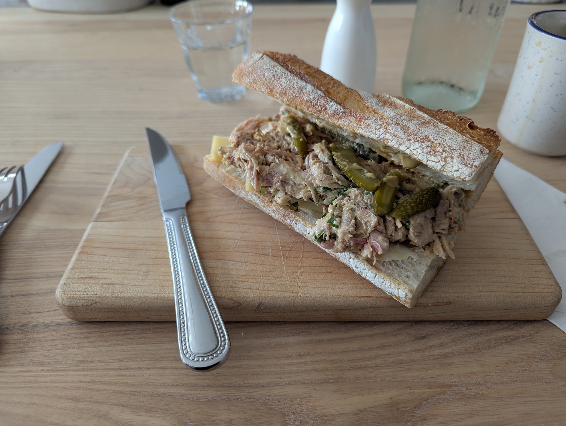 As for my self ordered the air fried half chicken with garlic sauted green beans, with a side order of fries. The chicken was cooked to perfection, moist and tender with a crispy skin smothered with a delicious cream sauce, the green bean were Al Dente, maybe a little too much al dente for my taste, but good. For dessert I tried the pot de chocolate ganache with creme fraiche and nuts, tasty and creamy. Coffee available, but no espresso, a must to any eateries "with it" nowadays. All in all, very decent place for lunch, with a decent menu, we will go back, there is a lot more items I...