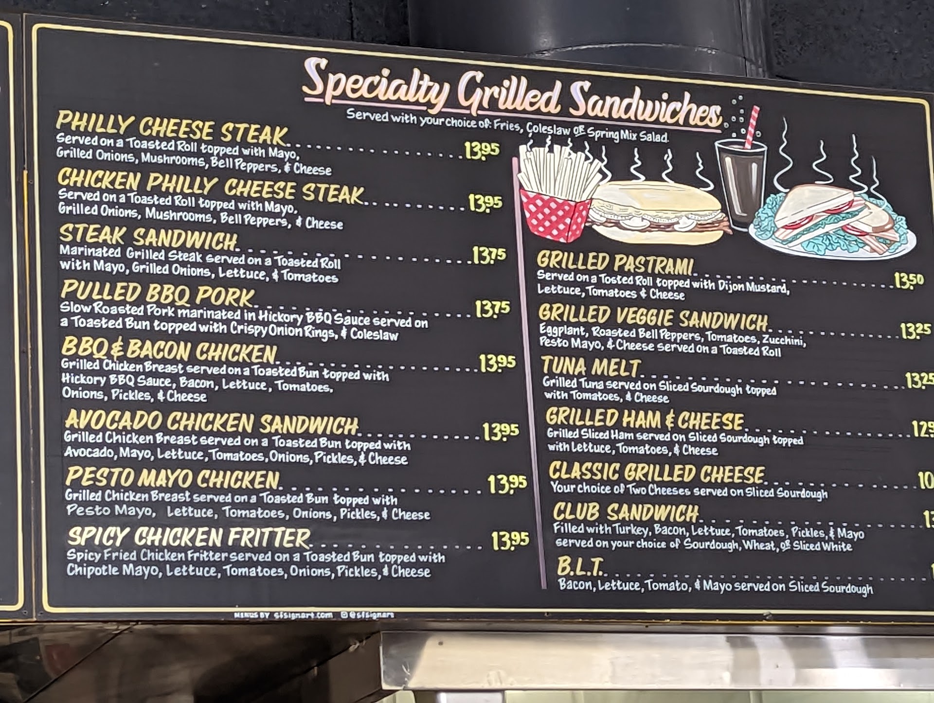 This restaurant in the Cesar Chavez Student Center at SFSU has a large selection of sandwiches and egg dishes, as well as a self-serve food bar. The made-to-order items usually take five to ten minutes. However, a broccoli and cheese baked potato I ordered took twelve minutes, but it was a big spud. The prices for the self-service food bar are calculated by weight (currently $9.75/lb), so you can have as much or as little of the food you want and pay proportionally. They have shrimp, if you're looking to get more value. In my opinion, most of the food is good. I hear their sandwiches are fantastic, so I'll give them a try next time. Service was good. Utensils and napkins were provided. Seating and restrooms were available nearby. Overall, this is a good place to stop for an...