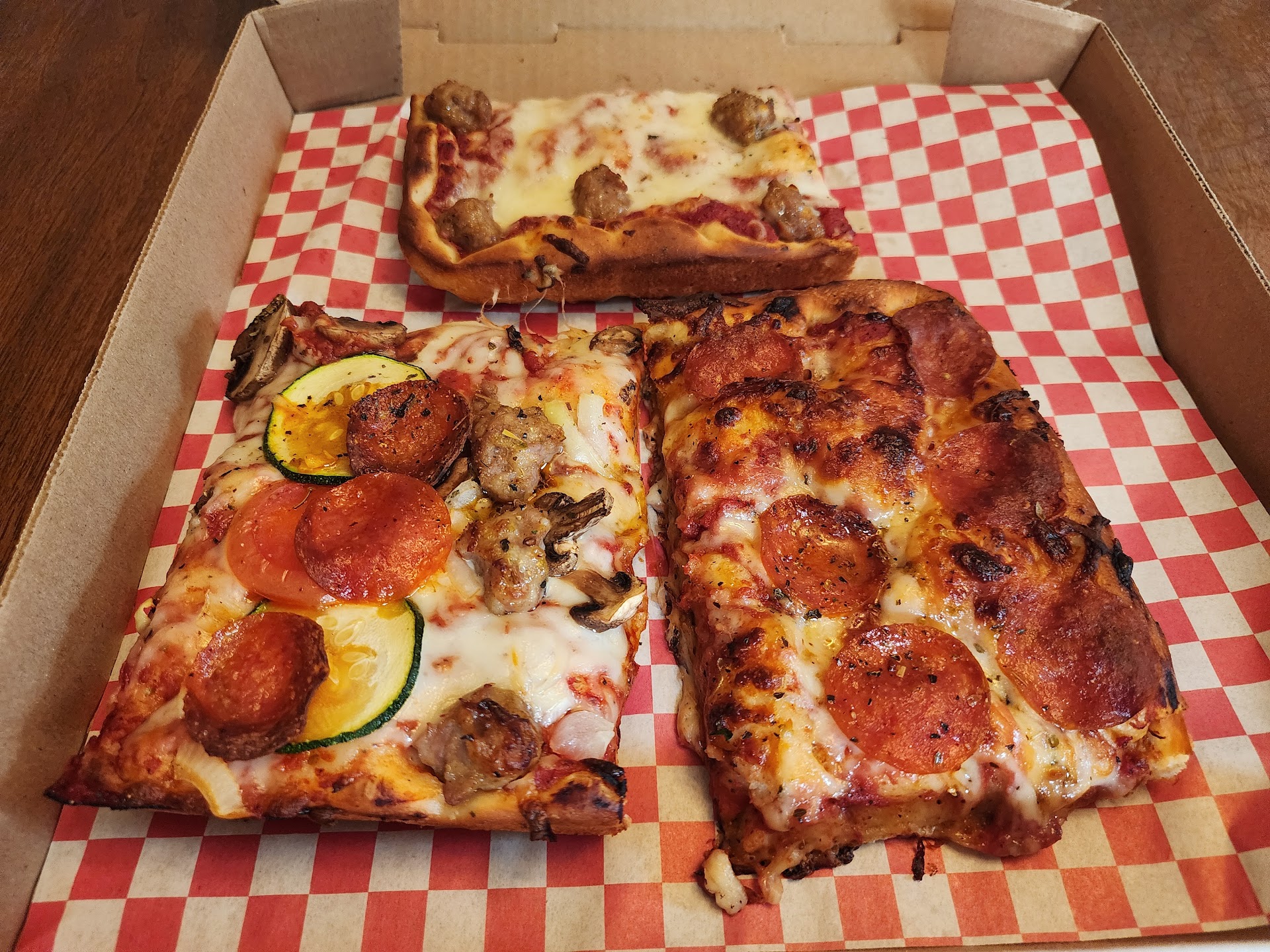 I got one slice of each of the pepperoni, sausage, and combo variants. All the toppings were cooked nicely: no blackened pepperoni, or undercooked veggies. The dough is nice and soft in the middle and super crunchy around the edges, and yet not in such a way as to injure my mouth as I eat it.