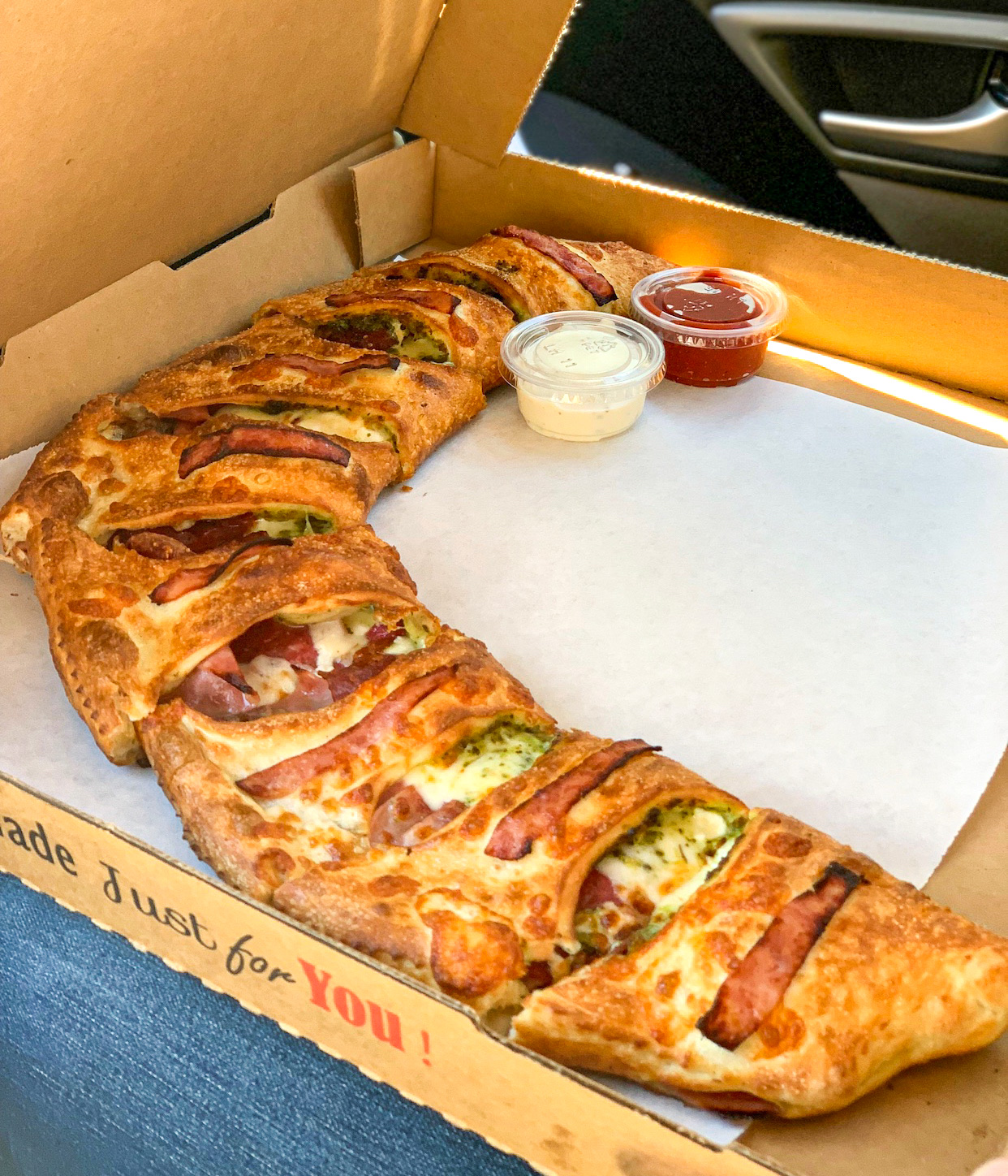 I have been looking all over for the perfect calzones and this place checks off all the boxes. I know each restaurant has their own way of making their calzones. A lot of the ones I saw were either too small, too much batter or looks too bulky. The calzones here are a work of art. I mean.. the picture says it all. They do not skip on any ingredients. It's the perfect amount of crust. The crescent shape is the definition of perfect. It tasted even better than it looks. We got the Meatlovers Calzone with pesto. $24 for a medium is win for me.