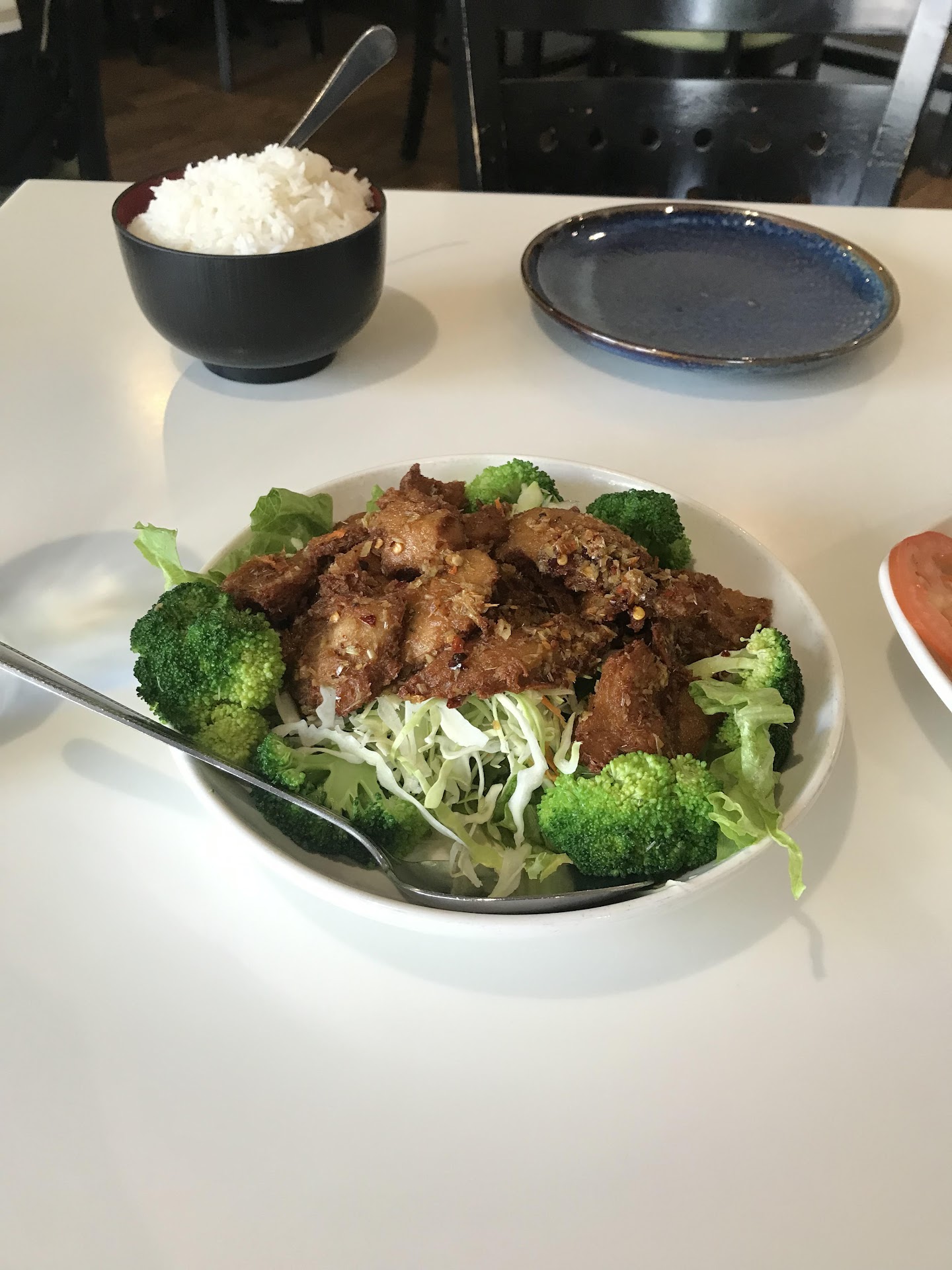 I am so glad that I got to go here! Everything I ordered was extremely flavourful and satisfying!!! The staff are friendly, kind, and very helpful, and the service is fast. This is what we ordered: Curry Wraps Steamed Bun Tofu Salad Wonton Soup Sautéed Basil, Eggplant, [Tofu,] and Mushrooms Iced Matcha Latte My sister asked me which dish was my favourite, and I ended up just listing all of them. They were all so good! I really loved the variety of options. I eat tofu, seitan, and soy protein “meat” every day, so I wouldn’t have minded if this restaurant chose to only use one of those protein sources, but I really appreciated the variety. The variety also extends to the flavour palette as well. The curry wraps could fit perfectly in a Burmese Restaurant (and they put the Burma Superstar “Platha and Dip” to shame). The steamed bun is giant, decadent, and about 20 times as flavourful as a pork, chicken, or shrimp bun (I used to eat these every single day before I went vegan so I know what I’m talking about). The tofu salad was light and refreshing, and the plum vinaigrette perfectly showcased the vegetables💕. Since wontons almost always have meat and I was vegetarian for over half of my life (before I went vegan), I can’t even remember the last time I had wontons. When I tried the wonton soup, it took me right back to my childhood. Fellow vegans and vegetarians know that it’s hard to go wrong with sautéed eggplant, mushrooms, and tofu at Chinese and Southeast Asian restaurants, but trust me when I say that this dish is extra-special. The texture of the eggplant and mushrooms is perfect, which is one one the only critiques that I tend to have of this kind of dish. I’m a tofu-lover, so I’ll eat it at any density/texture, but I can say that this tofu could convince some of the strongest tofu-haters to come to the light side. The Iced Matcha Latte was a drink that I was hesitant about since I generally don’t like sweetened drinks, but I was very impressed. I’ve tried matcha lattes at dozens of coffee shops and boba tea places, but the depth of flavour in this one is unparalleled. Most importantly, when you go to this restaurant, you won’t have to sacrifice any taste, texture, or quality of experience in order to have a ethical meal. Please go to this place, it is absolutely worth your time...