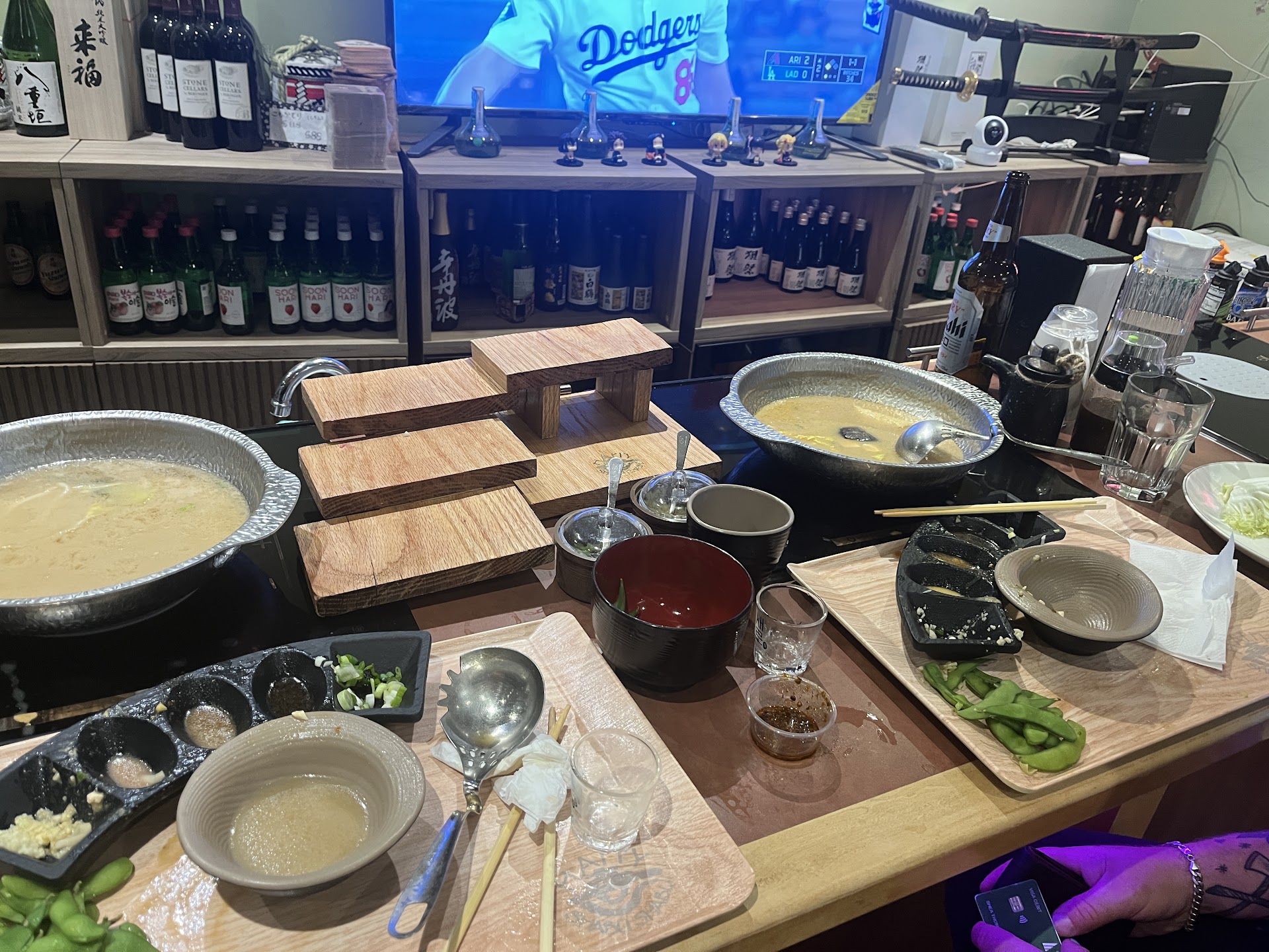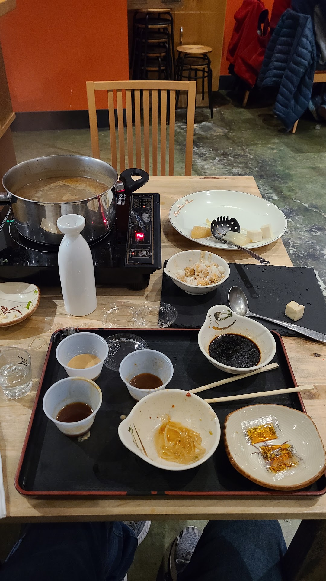 This place is alright but a little shady and lazy. They definitely dont have all you can drink and they bring you water and sake in the same plastic jugs that looks like they came from a dollar store. They didn't even let you know what type of sake it was or give you any choices and it tasted like vermouth. They waste a lot of plastic by giving you the tiniest amount of sauce in single use plastic containers that are usually only used for togo orders in other restaurants so I alone had 12 in one meal so in a given night they are using hundreds of these little plastic cups, that end up in the trash, instead of washing real sauce dishes. It seems wasteful and lazy. Food is pretty good. The lamb had dark spots that was gross but I didn't get sick so thankful for that. Broth is a little watery and the pots only held one type of broth. Most places have those 4 way pots so you can have multiple types of broth. They say they close at 11 but they came by and told us they were shutting down the slicer at 10:13 and kind of were shoeing us out. They use a waiter instead of tablet system so the waiter can hide in the back and you get less food while waiting or have to go in the back and get her. There was a lot that just seemed lazy. They need to get tablets for people to order from and actual real glass or porcelain water, sake, and sauce containers. The plastic it tacky and cheap and lazy. I don't think Id come back here or recommend it. They need to take down the picture of the menu on google that says all you can drink. Thats literally what we came for. If they are going to be all tacky and lazy with bad sake in a plastic jug they could at least have bottomless drinks as they advertised. Sake was not...