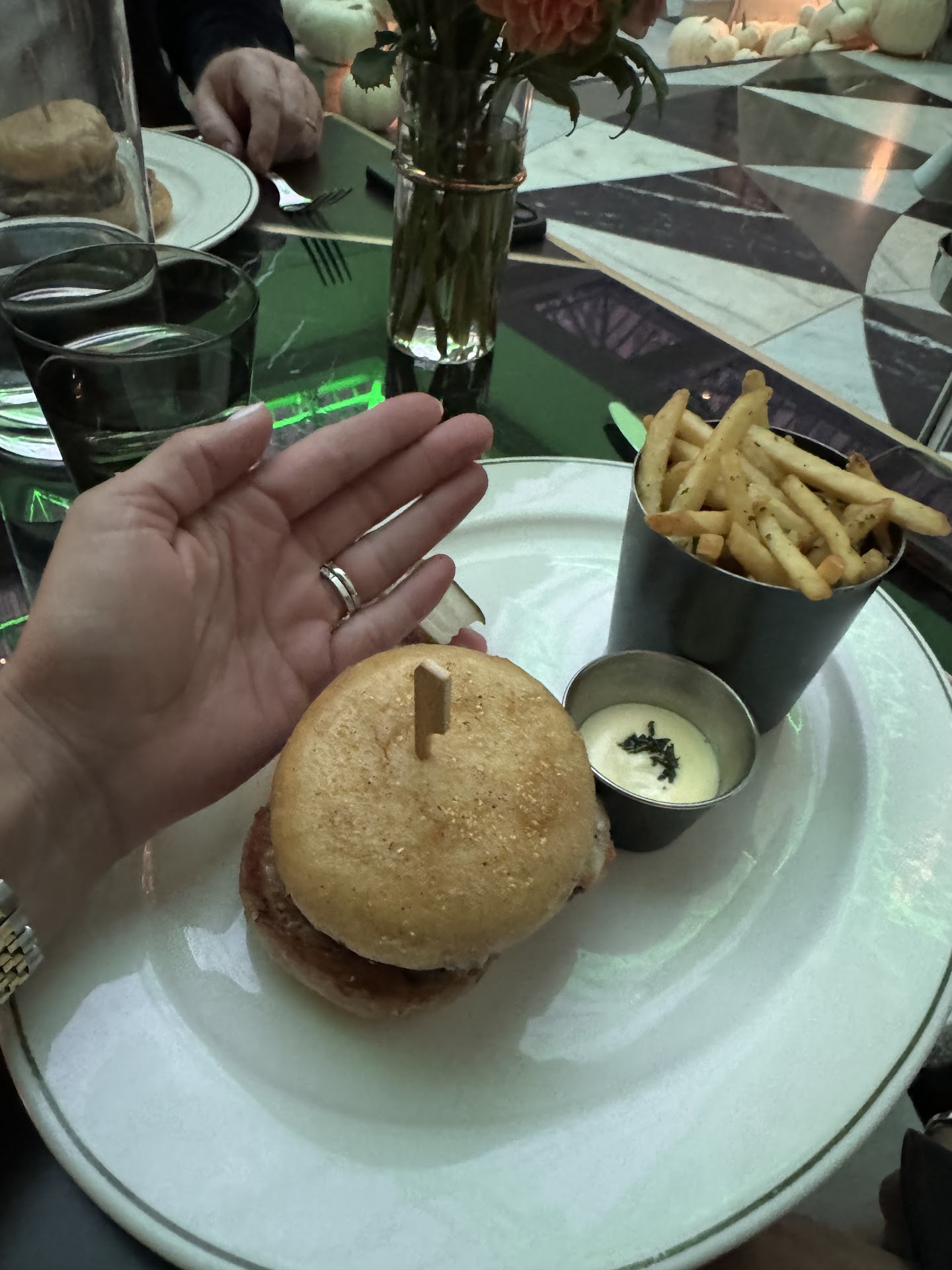 I reserved a table for 13 for an 80th birthday celebration. My original reservation had been for 12 at 7pm but we ended up changing it to 5:30 for 13 people. I confirmed the change over email with their guest services sales manager. I have 3 emails with the correct time and number of people. She had even put me in touch with the company that does their florals to make custom bouquets for the occasion. When we arrived we were told by the host that our reservation was at 7 and he was sorry. We went back and forth a bit (while all the guests were hanging around in the atrium and had been told they couldn’t be seated). I asked him to call the sales manager and he didn’t. When I showed him my emails he finally said he’d see what he could do. They finally squeezed us in and brought out my floral arrangements. Since we were squeezed in we were literally squeezed in between tables that were already eating and my guests ended up with their chairs literally touching the chairs of the people next to us. Thank goodness we are not bigger people otherwise we wouldn’t have fit. I was thoroughly embarrassed at this point but it didn’t end there. With a big group, the sales manager indicated we would have to get the price fix menu and order our entrees ahead of time. We only ordered burgers and salmon and were told to order the same first dish for all the guests. I picked the kale salad. The salad was fine but the entrées were embarrassing at best. The burgers looked like sliders, they were so so small. They were all cooked well done and were dry and shriveled. They were so small that they looked comical on a plate with a cup of fries (closer to half a cup). I added a picture of the tiny burger next to my hand for comparison (I have big hands for a woman!). The salmon portions were small as well but better than the burger I guess. The puree or whatever was served with the salmon was slimy and I still can’t tell you what it even was. There was a handful of leafy greens on the plate that seemed like someone grabbed a handful of greens from the bagged salad and put it there with no purpose other than to fill the plate. I ended up ordering a bunch of deviled eggs to supplement the meals because the guests were still hungry. The only part of the meal that was ok was dessert. The martini I ordered was meh at best. They only have 3 choices of vodka and they make it table side, stirring the vodka and anything you picked to add with a spoon instead of shaking it. Not sure what the purpose of table side martini carts is if they literally take the ingredients and stir them and pour your drink. Granted, I don’t know what I was expecting, but that wasn’t it. The waiter was good, hence the 3 stars for service instead of 1. I had my birthday celebration here last year and it was actually lovely so I am sad and disappointed that this celebration was so poorly executed and the food was so bad. I was trying to host an elegant and memorable dinner for a special event and it ended up being an...