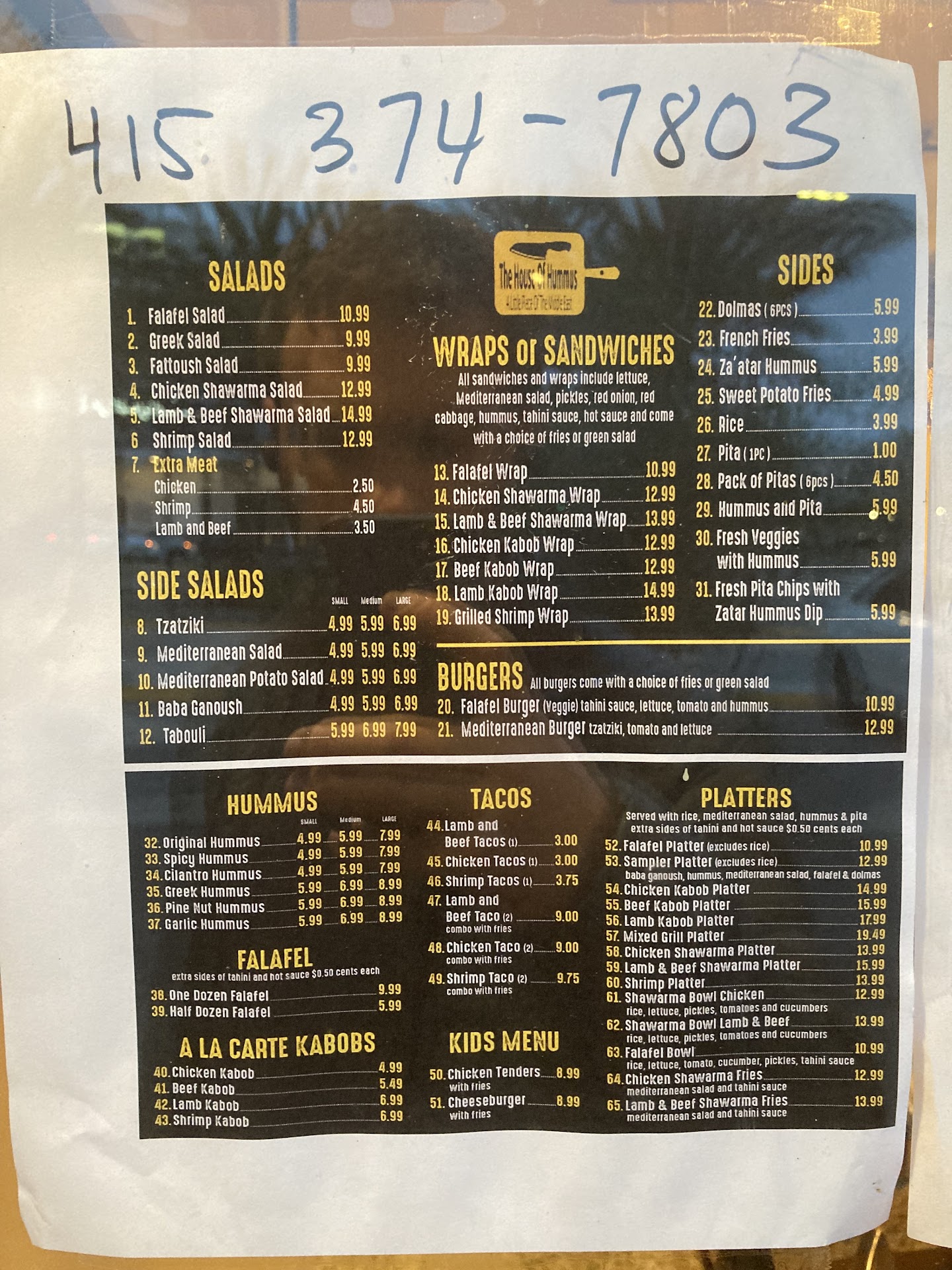 Read moreHouse Of Hummus is an underappreciated gem! I've eaten here several times and thoroughly enjoyed every meal I've had. The food is fresh, flavorful, generously portioned, and usually quick. I highly recommend the chicken kabob platter. They're able to accommodate larger groups, usually because they are not as busy as they deserve to be-- my work group of 13 people has been able to come here at lunchtime and sit together without a reservation before. The space is more relaxed than many restaurants in San Francisco and has good parking availability on the street, in the few spaces directly in front of the building, and in the shopping complex across the street. I get the impression that it's owner-operated as a family business, and they're very welcoming. I hope they have enough customers to stay in business...