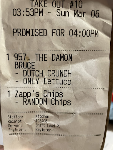 Read moreIt's called Ike's Love & Sandwiches, but I was shown no love today when trying to get a Damon Bruce. I placed an order to dine in, sandwich and a bag of chips. After noticing customers who ordered after me getting my food, I tried to ask the cashier who took my order about the status of my order, he straight up ignored me. We can just call him Brown Hat, since that is what he wore (Shift Lead-P, is what my ticket called him). He didn't look up at me and wouldn't acknowledge me standing 3 feet from him. Then I tried to ask the manager on duty, Pony tail with a gold chain, he also took a phone call and ran off. Didn't want to talk to me. So, I had to awkwardly wait at the counter to make myself known. And wouldn't you know, now they wanted to pay attention. So, they checked the to go order rack and my order had been waiting for 10 minutes. No one told me it was ready and I had to go up and find out myself, who knows if they would have ever told me themselves! It was packaged with BBQ chips, now I know they really weren’t paying attention! I ordered at 3:53PM, was promised my order at 4:00PM and didn't get it until 4:10PM. Please look at my receipt.
