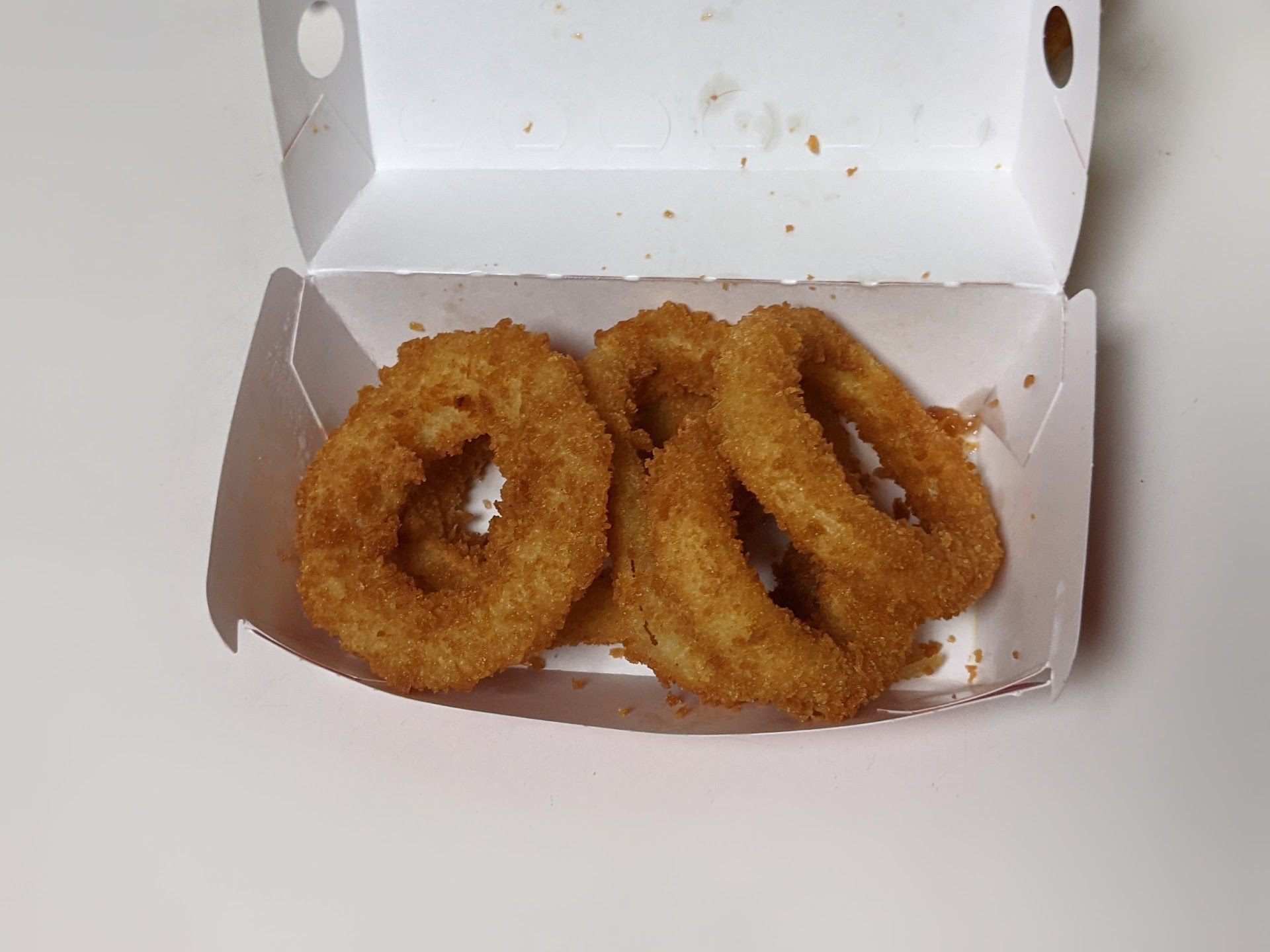 I was taking a stroll and just felt like getting some onion rings (I love a good onion ring) so I searched up where I could get some and went in here. I haven't been in Jack in the Box despite living just a few blocks away. The interior is quite quaint, with just a few seats and tables to eat at. The man who took order was very friendly. I asked for one order of onion rings and nothing else. He offered me fries for free. I glanced and noticed a mound of fries, both regular and curly, in fryer baskets suspended over the fryer. He was probably just trying to get rid of them so they didn't have to go to waste. I said no thanks but he asked again, so I said no thanks again. He stopped insisting so I paid and got the receipt. The onion rings were $4.99 but because of a city health fee thing and tax, they turned out to actually be $5.58. I waited for a while and got my bag of what I thought were just onion rings. He said "have a good day" and I replied "you too." Great service. I looked inside the bag and there were two little satchel bag things (I'm not familiar with Jack in the Box sizes), one with regular fries and the other with curly fries.