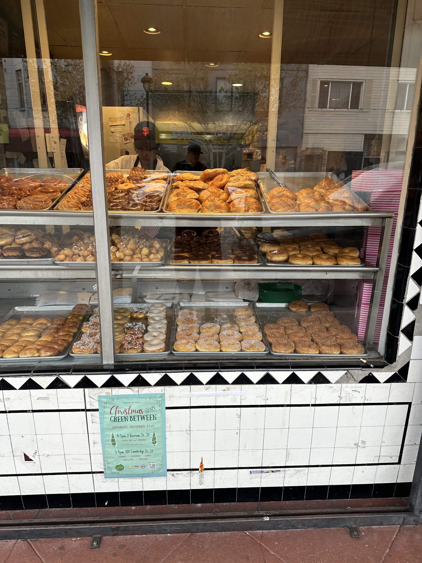 First time I've been there, I needed to sit and have a donut... Average price, TV with Wimbledon on and it seems to be very tired to the local community. At least 3 different customers camec in and chatted about life/neighborhood you're things with various employees. I love the local donut shops in SF. They are an essential business to keep neighborhoods together on multi-generational, diverse income, race... Just the neighbors who need a sweet baked good and maybe a coffee. Plus this one has burgers, fries and a couple other real food type items. Definitely coming back if I'm over near Silver Ave.